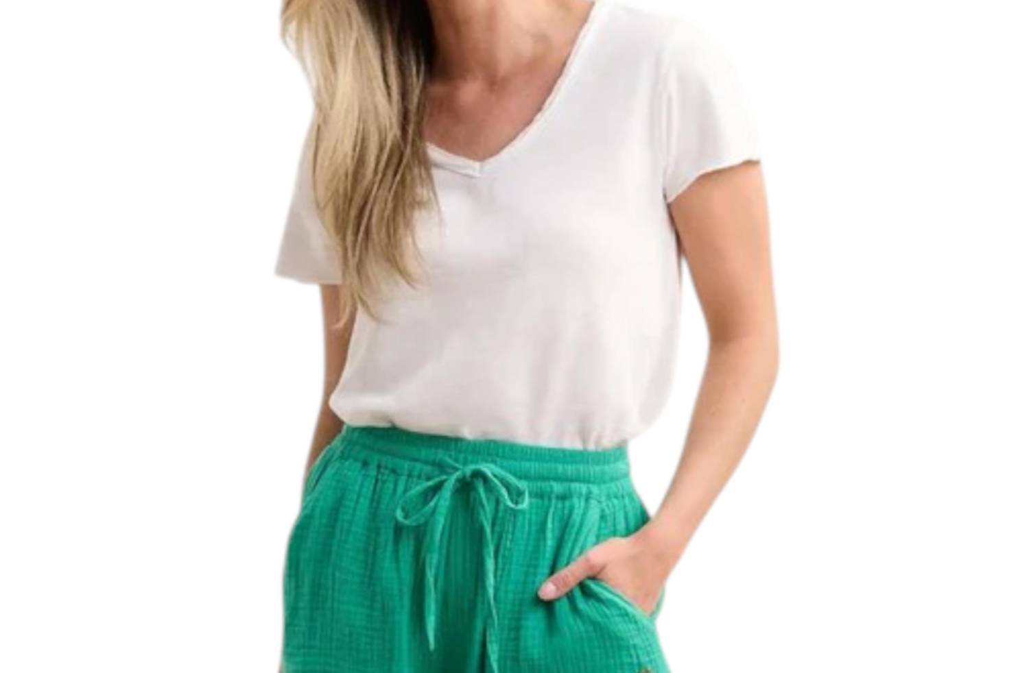 The short sleeve tee you'll want in every color. Discover effortless style with the Sadie V-neck Tee Top by Hatley, crafted in refreshing white cotton for your summer outings. This short sleeve tee is defined by its playful raw edge detail and minimalist, solid pattern. With a comfortable straight fit, it features a flattering V-neck design and a convenient pull-on closure. Easy to maintain, simply machine wash for hassle-free care.