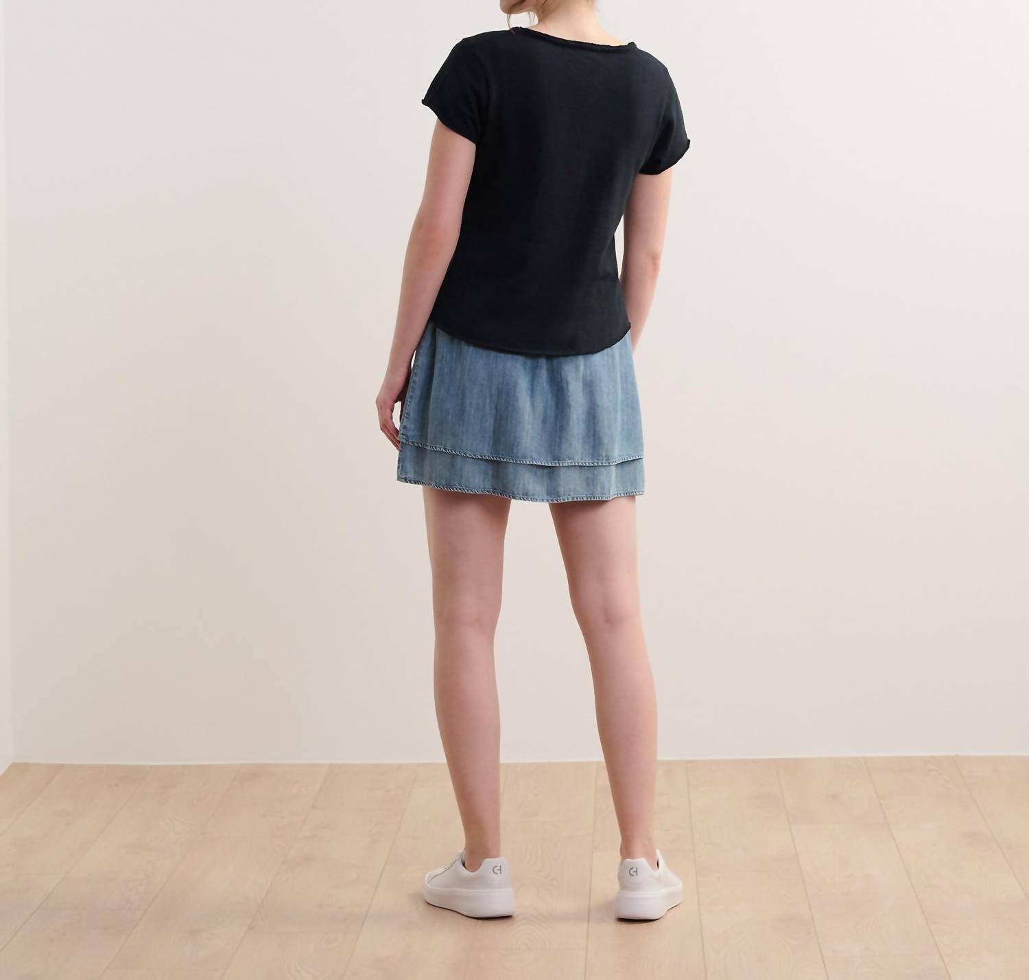 Discover the Sadie V-neck Top by Hatley, a stylish essential for your summer wardrobe. Made from soft cotton, this short sleeve tee in Caviar Black boasts a modern raw edge detail and a flattering V-neckline. Enjoy its solid minimalist design that pairs effortlessly for a dinner party or casual outing. Care: Machine wash.