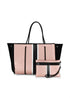 This neoprene tote is the perfect blend of style and functionality. Ultra light weight. Side panels expand for a phantom shape or snap in for a streamline look. Removable hard bottom liner and wristlet pouch.