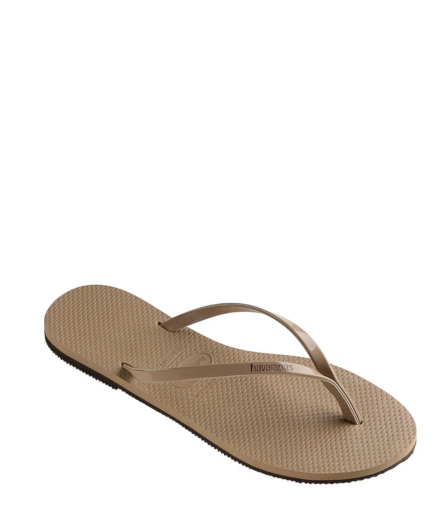 Flowy dresses, cropped pants, and even jumpsuits... this sandal works with them all! Introducing the Women's You Metallic Sandals by Havaianas in a chic Rose Gold hue, perfect for any summer occasion. These open-toe flip flops boast laminated vegan leather straps with a metallic finish and a bi-layer footbed that adds a touch more height. Made from flexible premium Brazilian rubber with a signature textured footbed, they ensure both comfort and style. Crafted in Brazil, these sandals feature a slip-on design and a Havaianas rubber logo, with an outsole composed of 100% rubber.