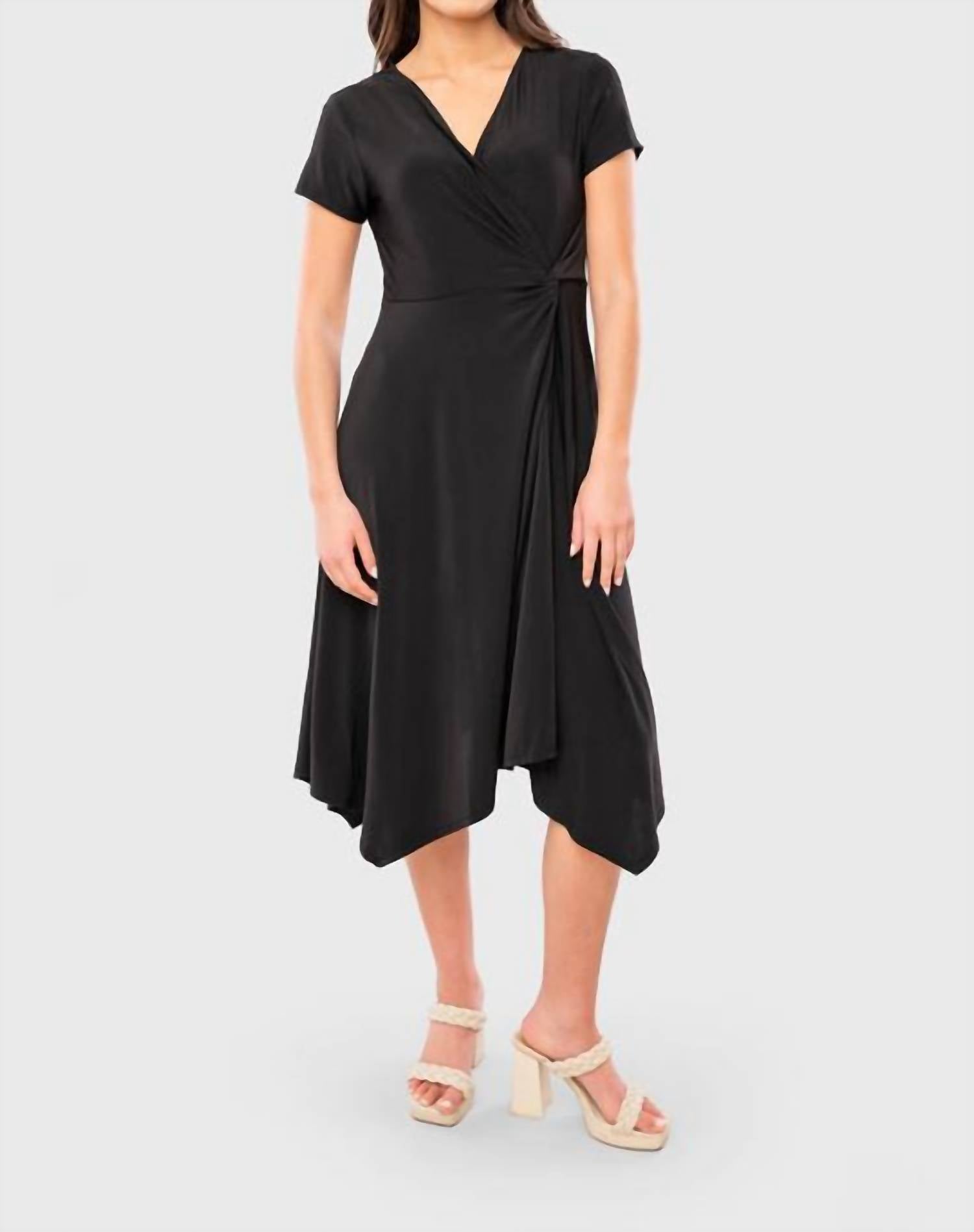 Just add slides or mules and you are good to go. The Back to Basics Dress by Heart of Pine is your go-to for versatile fashion. This midi-length A-line dress in a classic black solid pattern features short sleeves with a flattering side twist front and a surplice V-neckline. Made from a soft and stretchy ITY knit fabric composed of 95% Polyester and 5% Spandex, it offers effortless comfort. Closure: Pull on. Care instructions include machine washing cold and tumble drying low for easy maintenance.