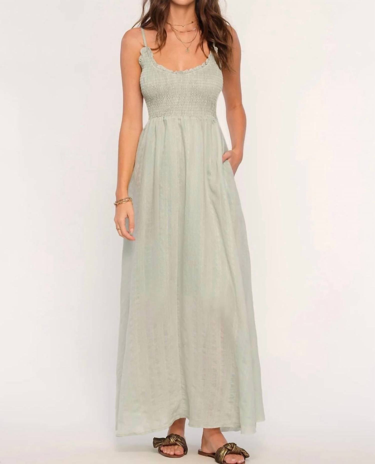 Introducing the Anya Scoopneck Maxi Dress by Heartloom, perfect for a boho chic summer look in Mermaid. This sleeveless dress is made from a soft, striped voile fabric with a relaxed, empire waist silhouette featuring a fully smocked bodice and adjustable straps. It is composed of 73% Rayon and 27% Nylon, boasting a garment length of 52 inches with practical side pockets. Closure type is a pull-on style, and care is a breeze with machine wash instructions.