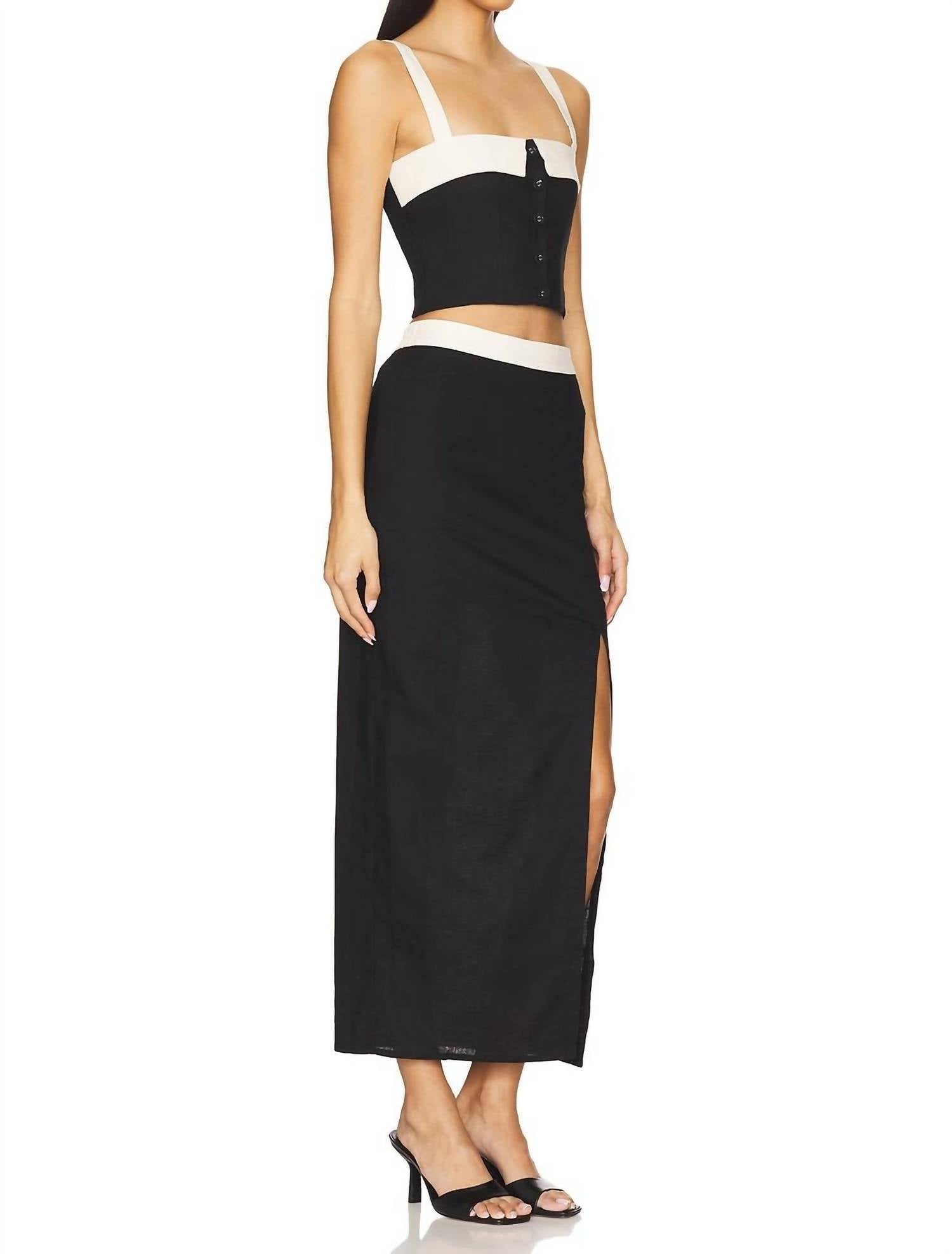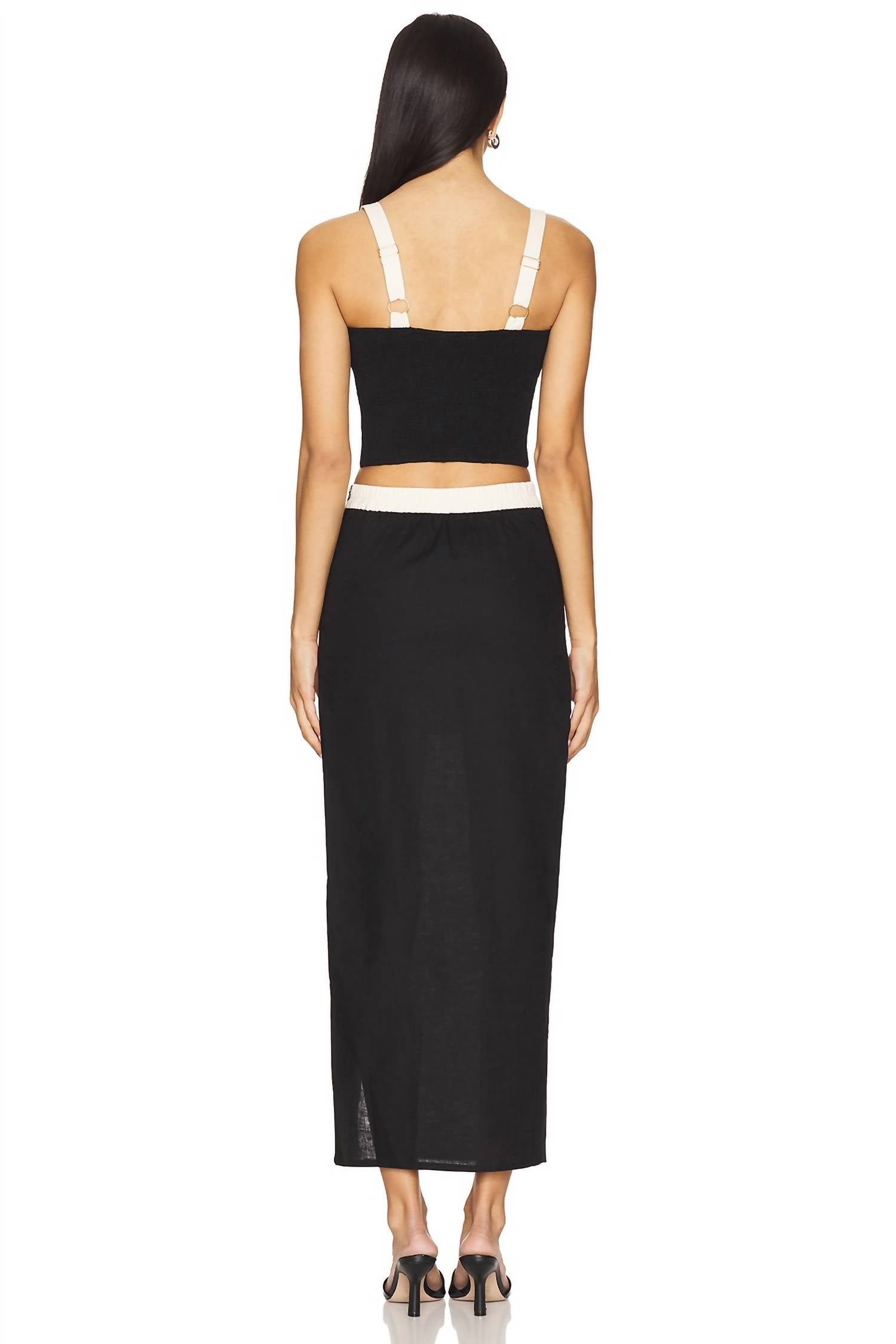 Introducing the Fontaine Set by Heartloom, a chic ensemble crafted from a 70% cotton and 30% linen blend designed for summer elegance. This sleek black set features a matching top and skirt with contrast white panels, perfect for versatile styling, including a skirt length of 37.5 inches. Originating from China, the set is uniquely detailed with smocking at the back and a side slit, offering comfort and style. Featuring a button closure, it's ideal for a dinner party occasion, embraced in the quiet luxury trend, and requires dry clean care to maintain its allure. Top: 15".