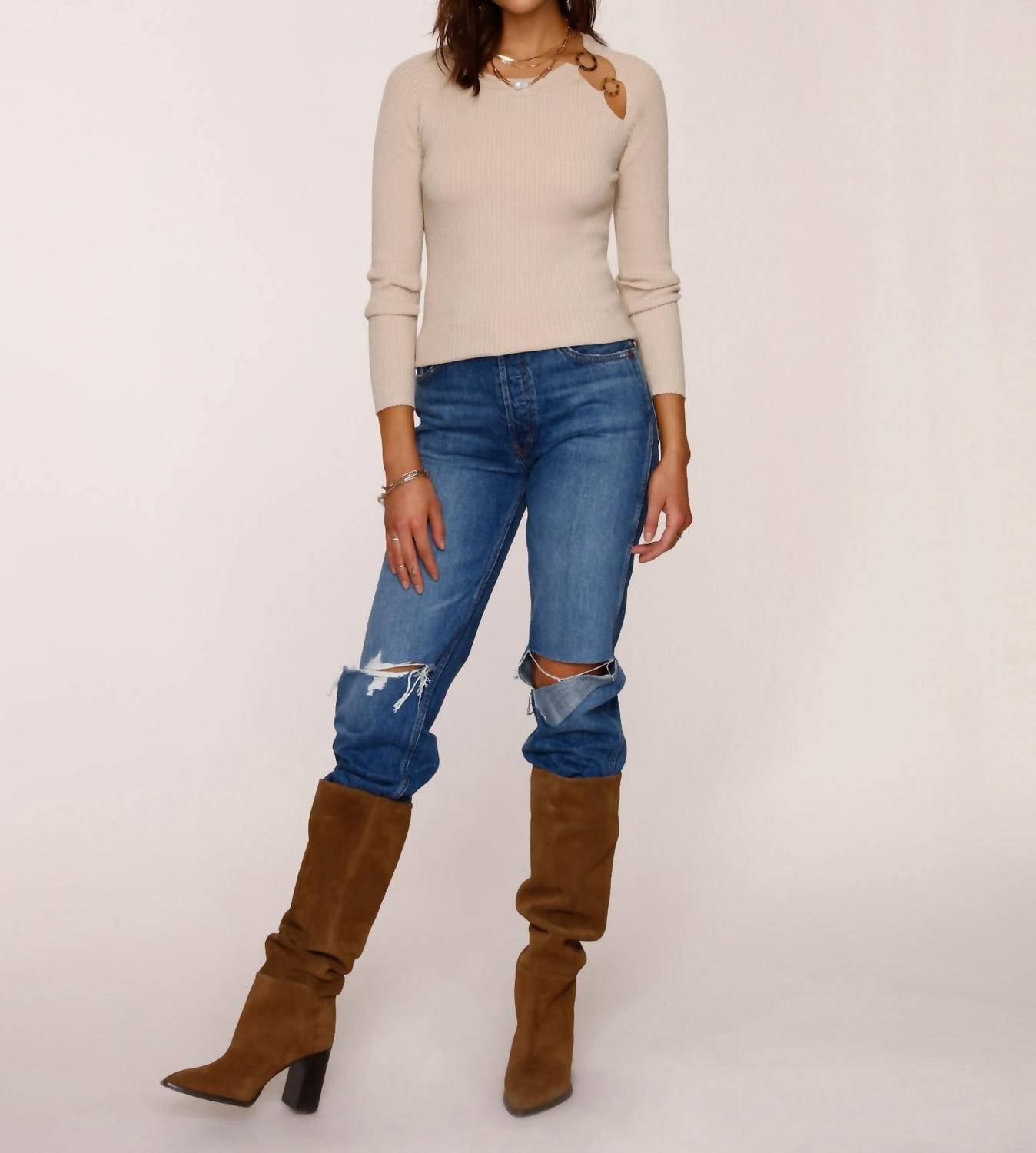 Experience the perfect blend of comfort and style with this trendy crew neck sweater, designed to effortlessly elevate your wardrobe. Pair it with your favorite denim and loafers for the perfect look. Discover the Marley Top by Heartloom, the perfect choice for a music festival with its unique design in a chic Bisque color. This long sleeve top showcases a distinctive cut-out with a tortoise ring detail and a flattering crewneck style. Crafted from a ribbed knit viscose blend composed of 64% Viscose, 18% Polyester, and 18% Nylon, it offers a slim fit silhouette with ribbed edges, measuring 21.5" from the high point of shoulder for size S. Pull-on. Hand wash and lay flat to dry.