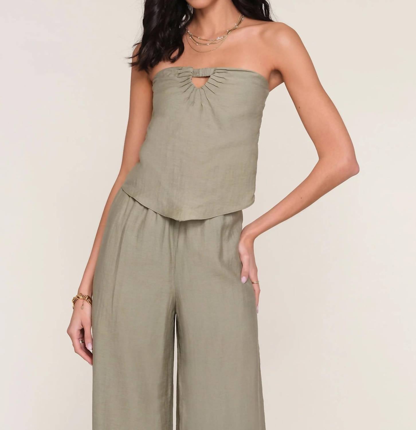 The perfect crop top for those warmer weather days. Elevate your summer wardrobe with the Violet Top by Heartloom, a solid green piece perfect for any dinner party. This strapless crop top showcases a chic squareneck and features a front keyhole for added elegance. Crafted from a luxurious blend of 67% Rayon, 18% Linen, and 15% Nylon, it promises both comfort and style. Closure: Pull on. Care instructions: Machine wash and lay flat to dry. The top measures 14.5 inches, pairing effortlessly with the matching elastic waist trouser (Inseam: 30.5 inches).