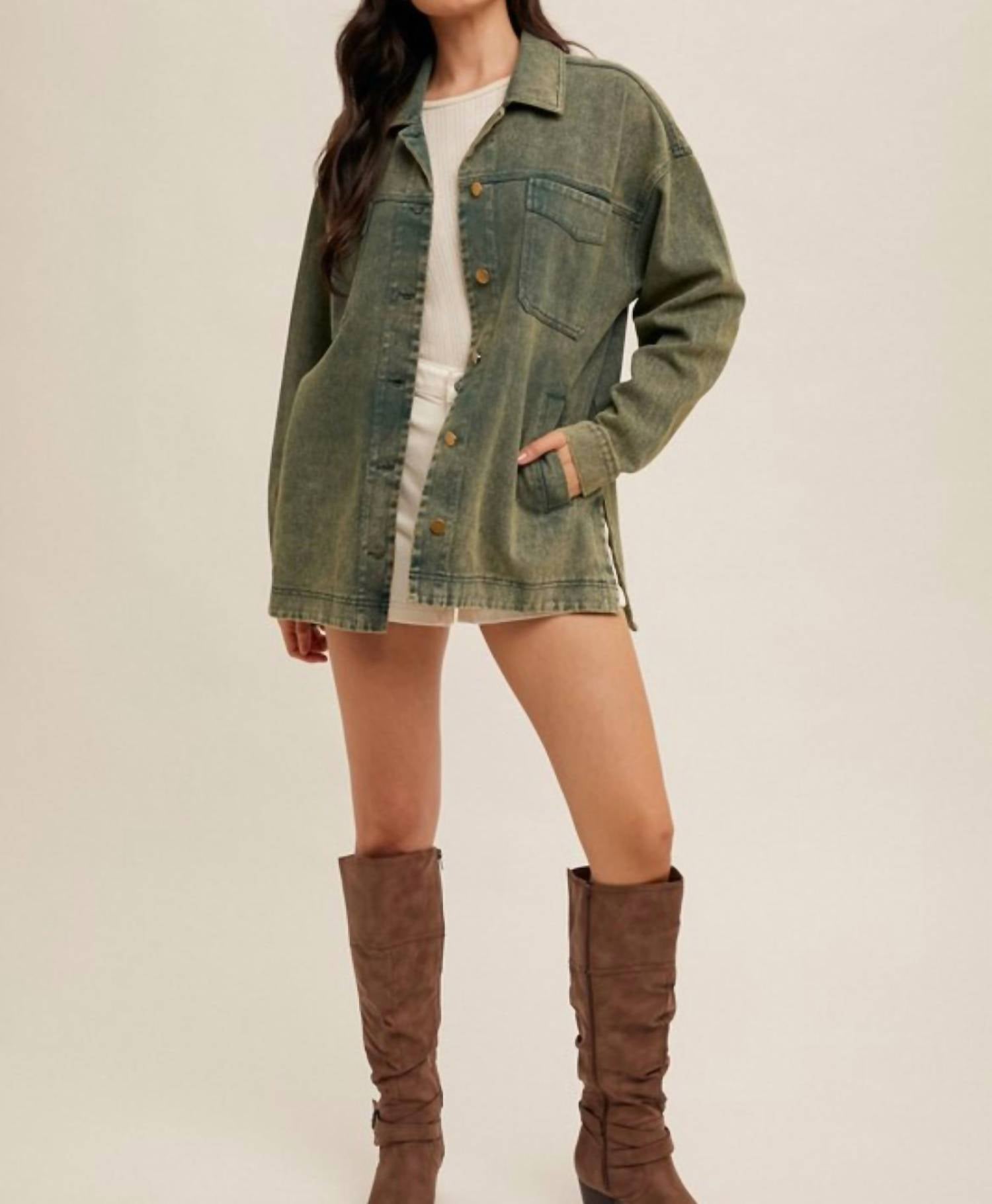 The perfect jean jacket for those slightly crisper days between seasons. Introducing the Distressed Oversized Jacket by Hem and Thread, a stylish addition for women seeking a relaxed yet edgy look. This Jean Jacket, presented in a striking green shade, features long sleeves and a classic collared neckline. Designed with convenient pockets and a button closure, it offers both functionality and fashion. Perfect for layering, this jacket adds a unique touch to any outfit.