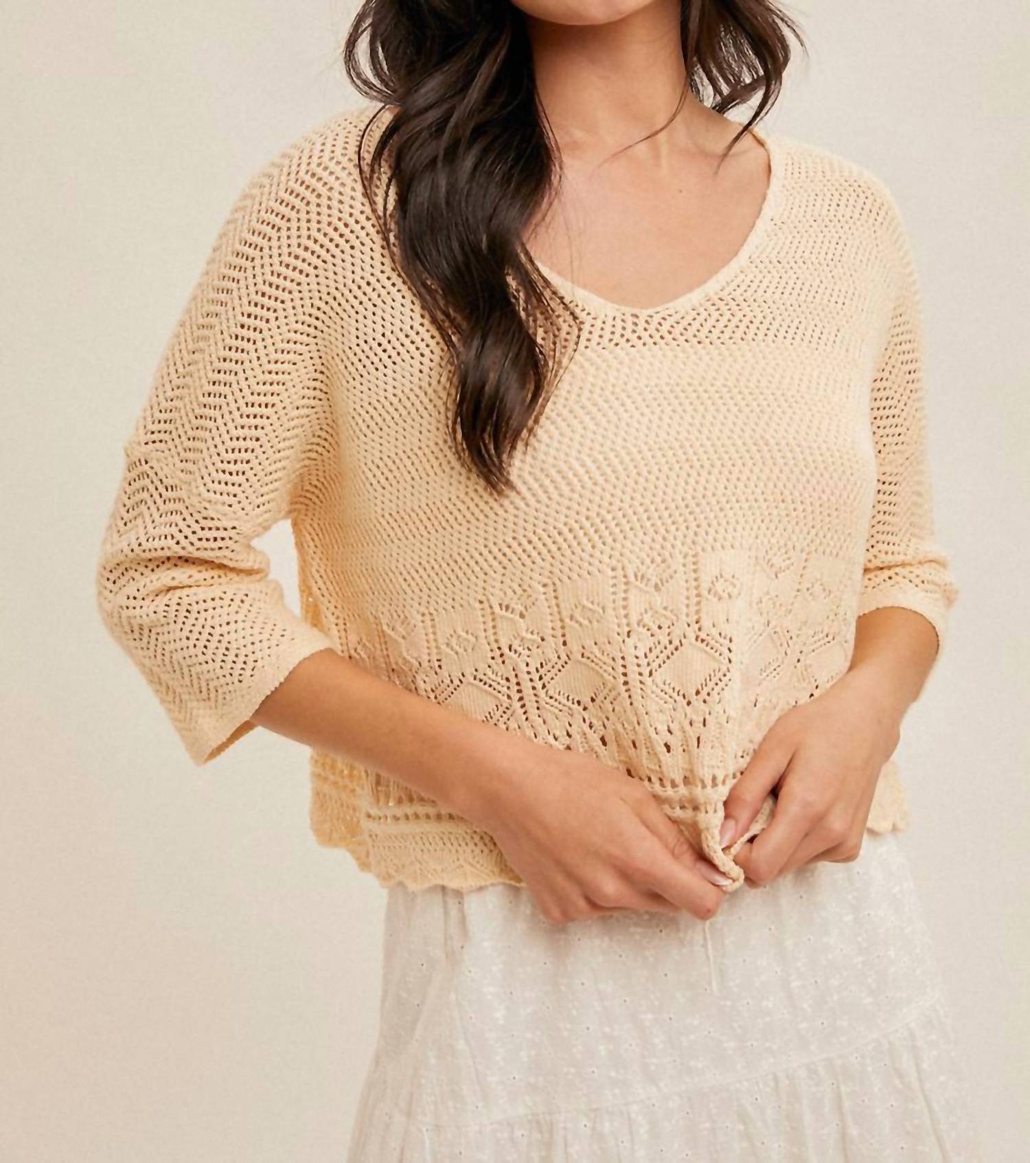 You'll be reaching for this comfy and classic v-neck sweater all season long. Elevate your spring wardrobe with the Meagan V-neck Sweater by Hem & Thread, offering a touch of boho chic in a textured ecru finish. Designed with three-quarter sleeves, this stylish piece features a flattering V-neckline. It’s perfect for vacation or Thanksgiving gatherings, with a convenient pull-on closure. For best care, hand wash and lay flat to dry.