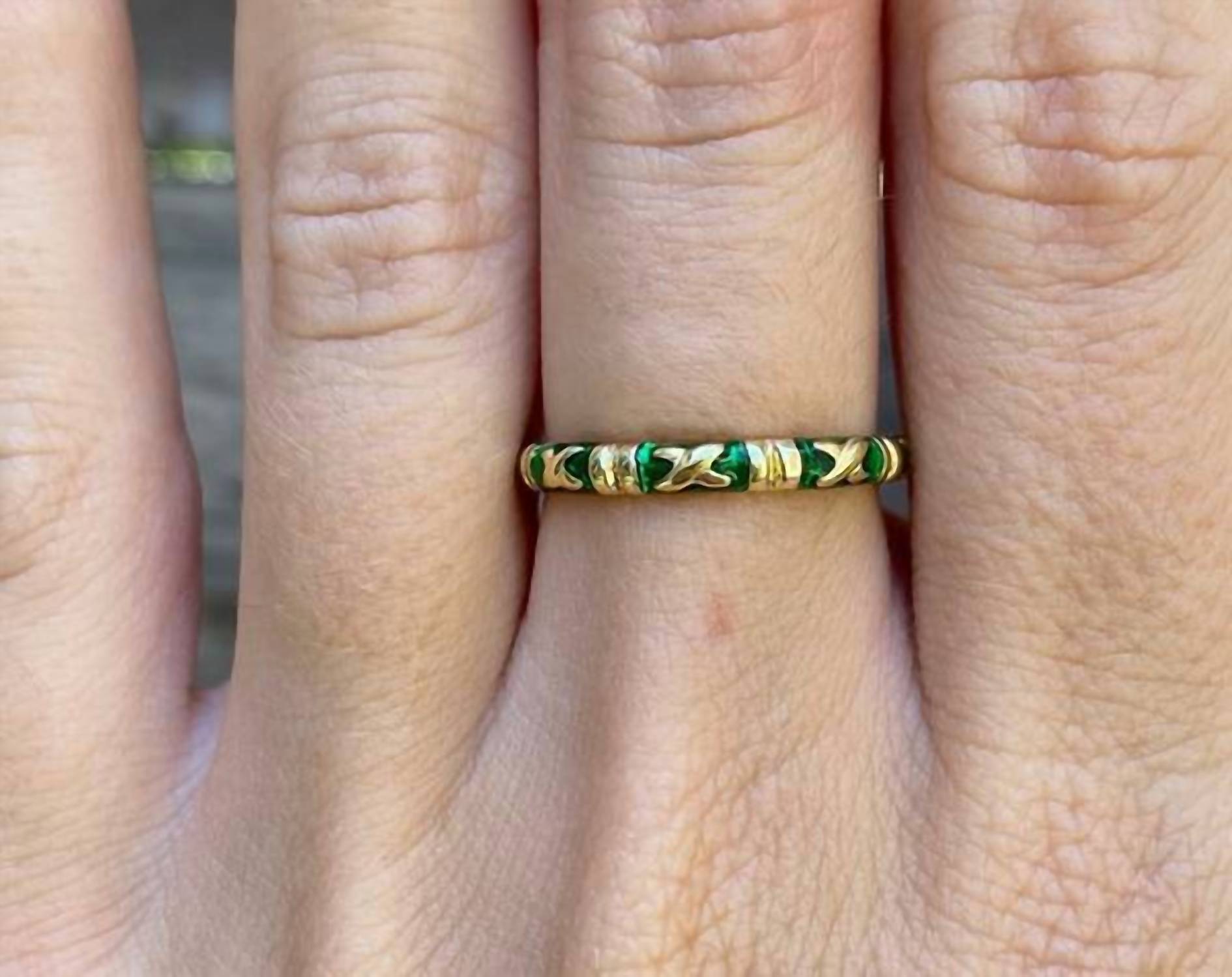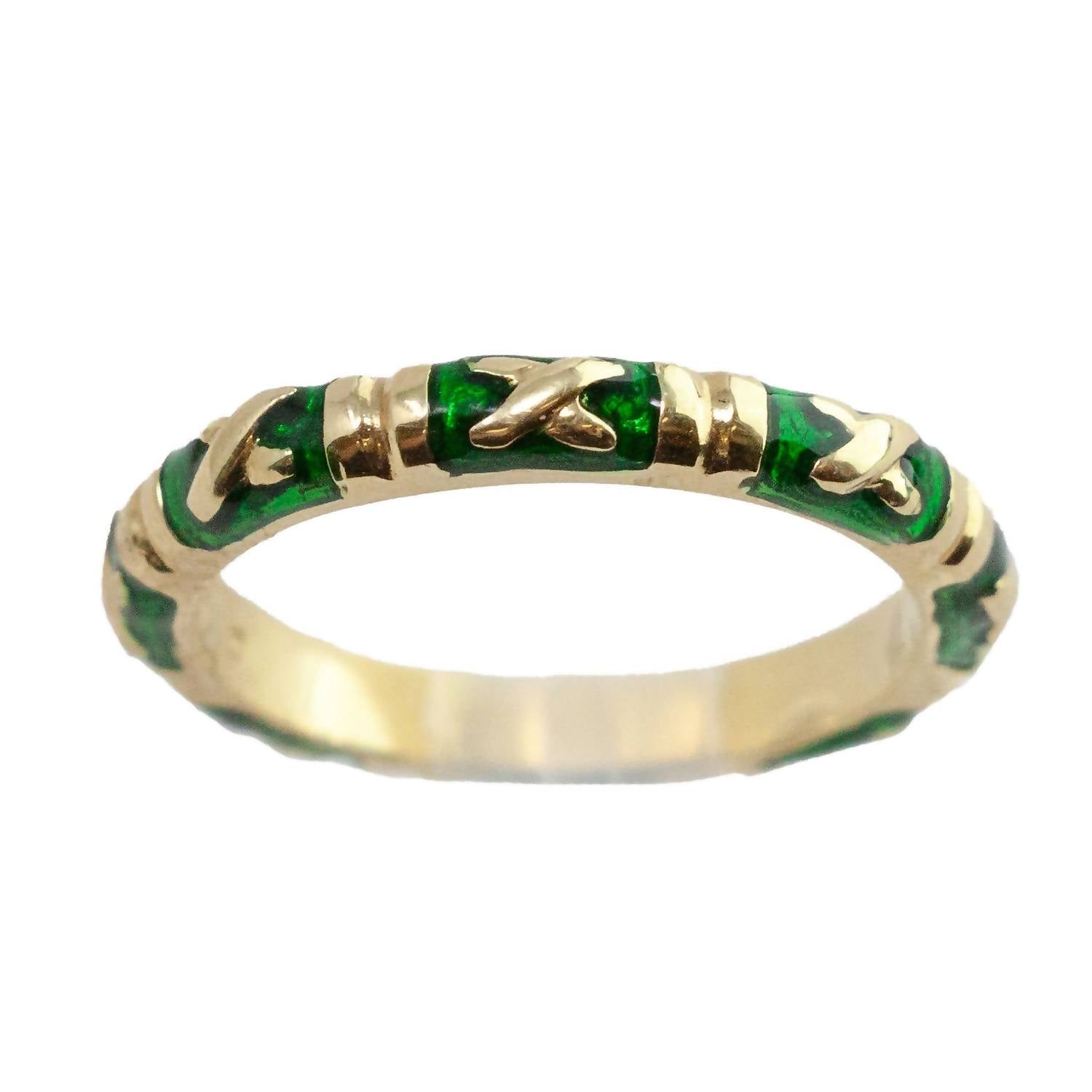 This ring will be your favorite go-to piece of the season. Discover the exquisite Green Enamel X Ring by Hidalgo, a fine jewelry masterpiece in 18k yellow gold. This elegant ring, designed in size 6.5, features a captivating green enamel finish that elegantly contrasts with its gold structure. Ideal for those who appreciate detail and craftsmanship, this piece is perfect for elevating any ensemble. With classic appeal and modern sophistication, it's a timeless addition to any jewelry collection.