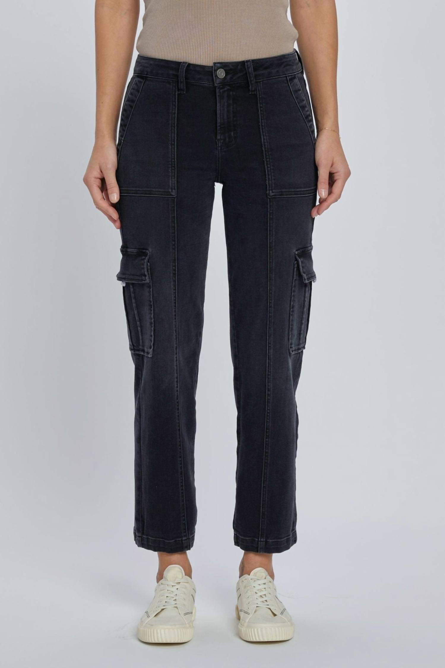 Pair these straight leg jeans with flats, sandals or even heels! You can't go wrong. Introducing the Tracey Cropped Cargo Pocket Pants by HIDDEN, a stylish addition to any wardrobe. With a relaxed fit, these straight leg pants are crafted from a comfortable cotton blend and come in a classic solid black color. They feature a 10" rise and a 28" inseam, complete with functional pockets and a button closure. Perfect for the modern woman seeking both style and comfort.