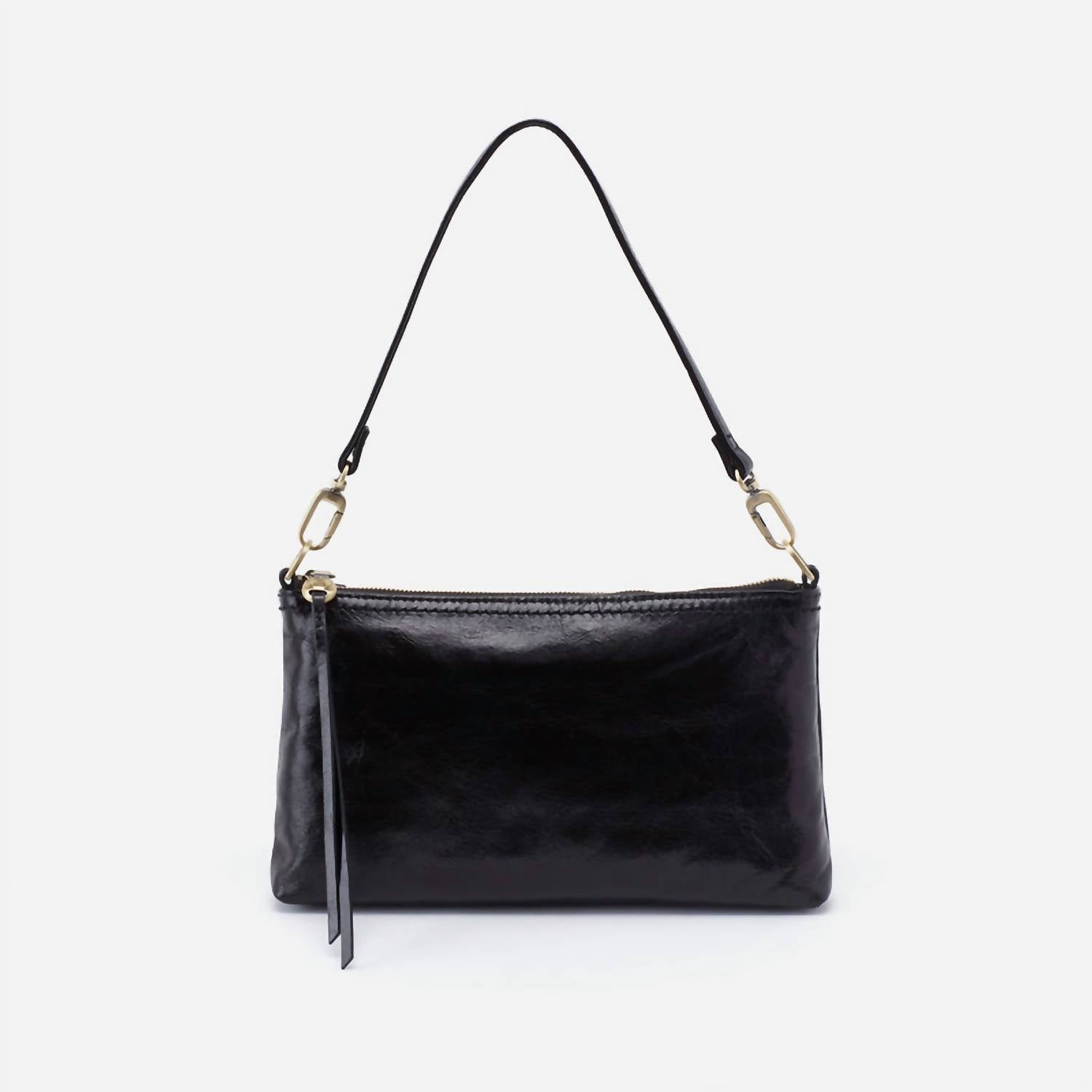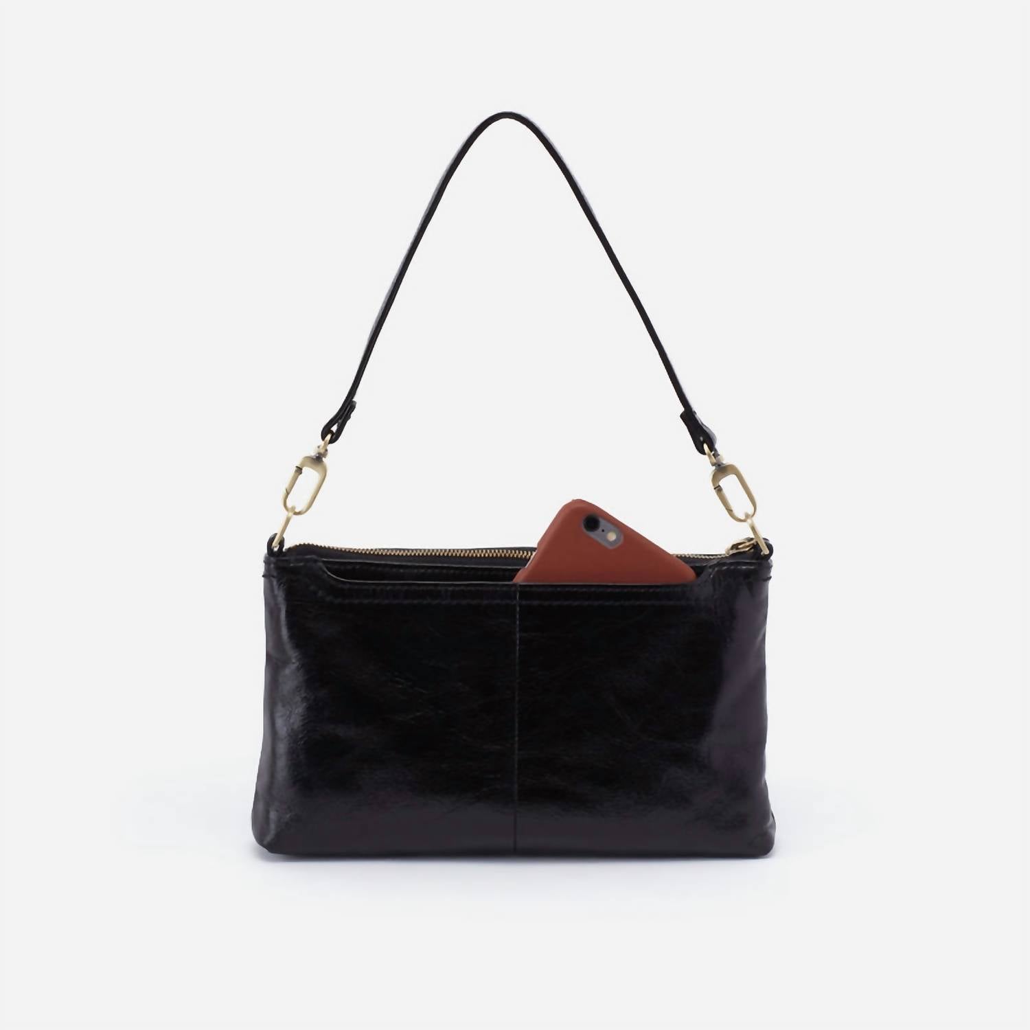 This crossbody bag will be your go-to bag of the season. Introducing the Women's Darcy Bag by HOBO, a versatile black crossbody bag crafted from premium leather. Designed with brushed antique brass hardware and a secure zip closure, this bag includes practical features like a signature phone pocket and multiple slots for bills and cards. With a changeable and detachable strap, it can be worn as a crossbody, baguette, or wristlet, boasting a sophisticated sandlewood lining. Measuring 9" W x 5" H x 1.5" D, the bag accommodates your phone comfortably, making it an ideal everyday companion.