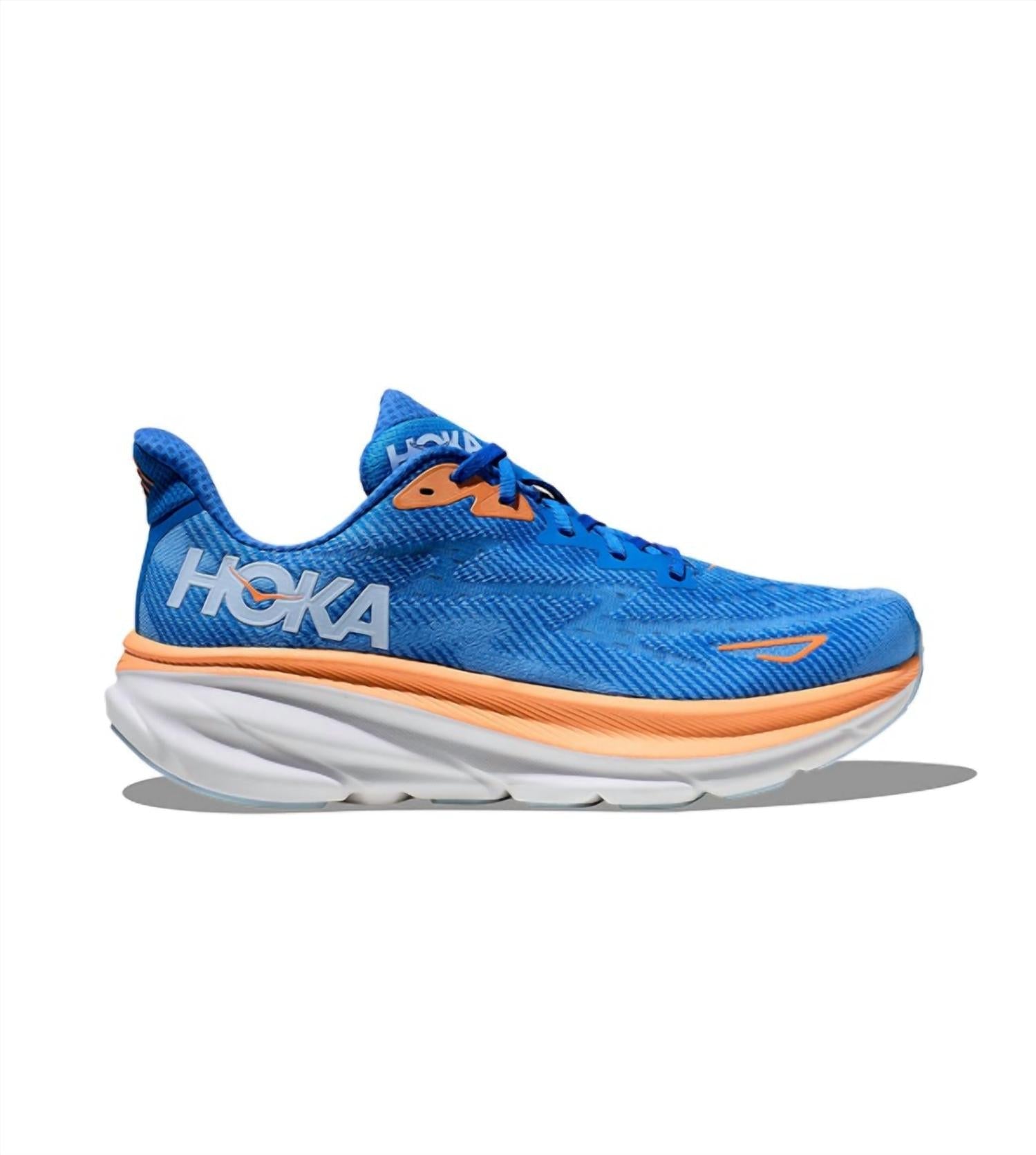 The HOKA Clifton 9 men's outdoor athletic shoes have a mesh upper for breathability and comfort, a lace closure for an adjustable fit, and a medium width to ensure a snug fit. They are designed to provide superior cushioning and support for outdoor activities, with a color scheme of coastal sky and all aboard.
