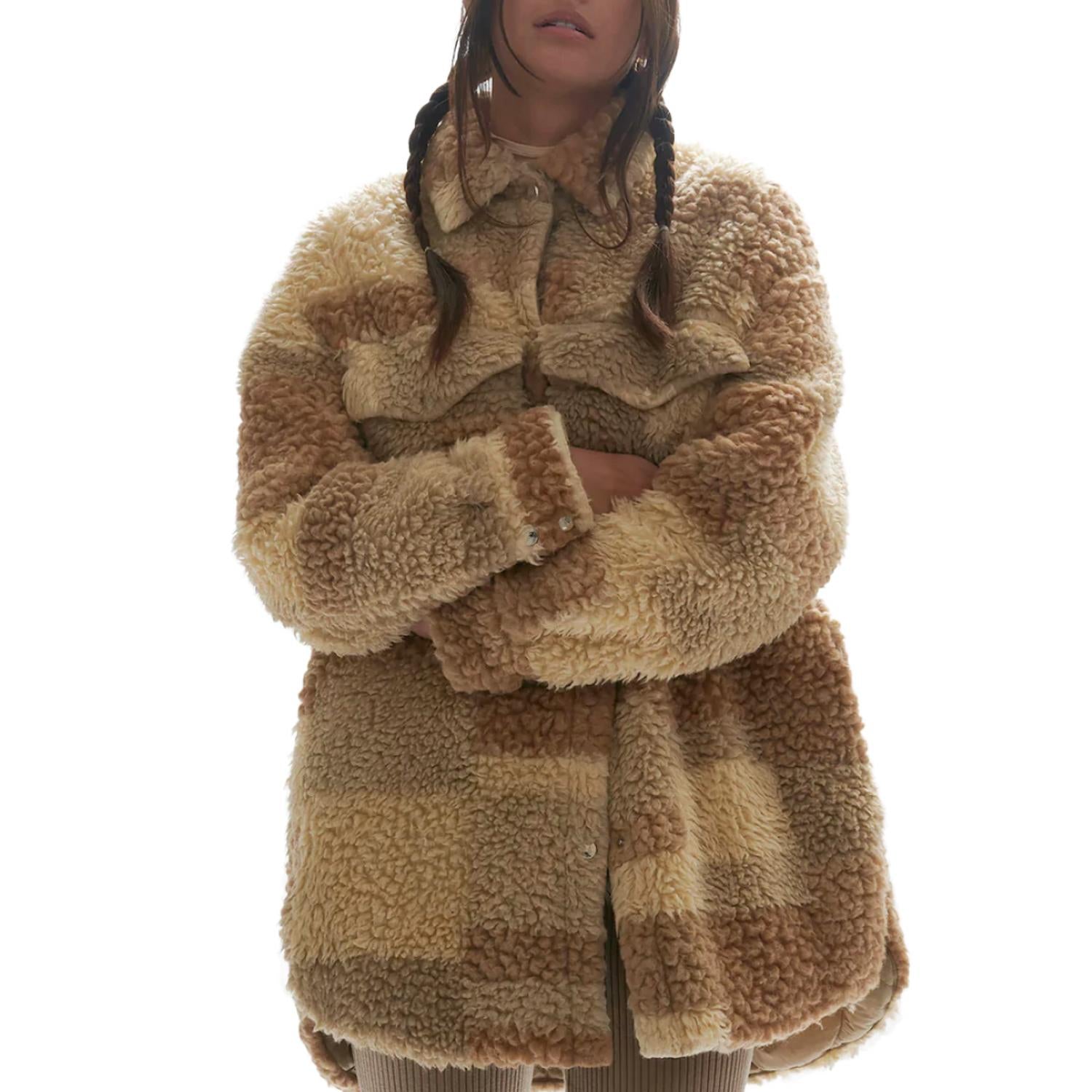Downright adorable and so comfortable you won't want to take it off. This teddy jacket is a fan favorite. Featuring a modern check motif with contrasting neutral hues, an oversized silhouette, a snap front and cuff closure, and chest pockets. Sherpa fleece texture. Collared. Recycled insulation/ Onion quilted interior. Materials: Virgin Wool, Acrylic, Poly. Made in Italy.