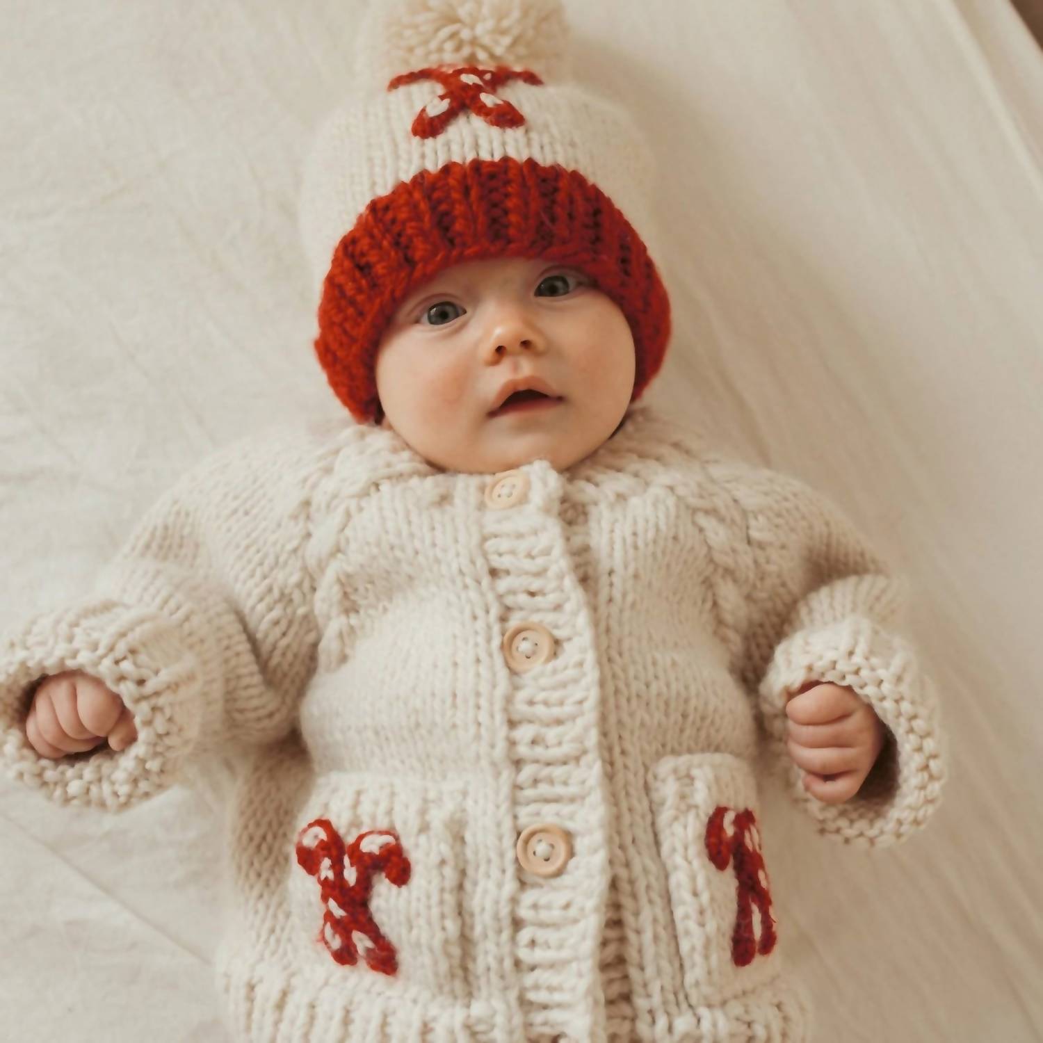 Dress your little one for the holidays with the Huggalugs Baby Girls or Boys Candy Cane Sweater, a charming choice in ivory and red perfect for festive fun. This unisex button-down sweater is adorned with whimsical candy canes on each pocket, adding a playful touch to their outfit. Made from 100% Acrylic, this cozy piece is ideal for keeping your baby warm during cooler months. Originating from China, it pairs beautifully with the matching hat for an adorable holiday look.