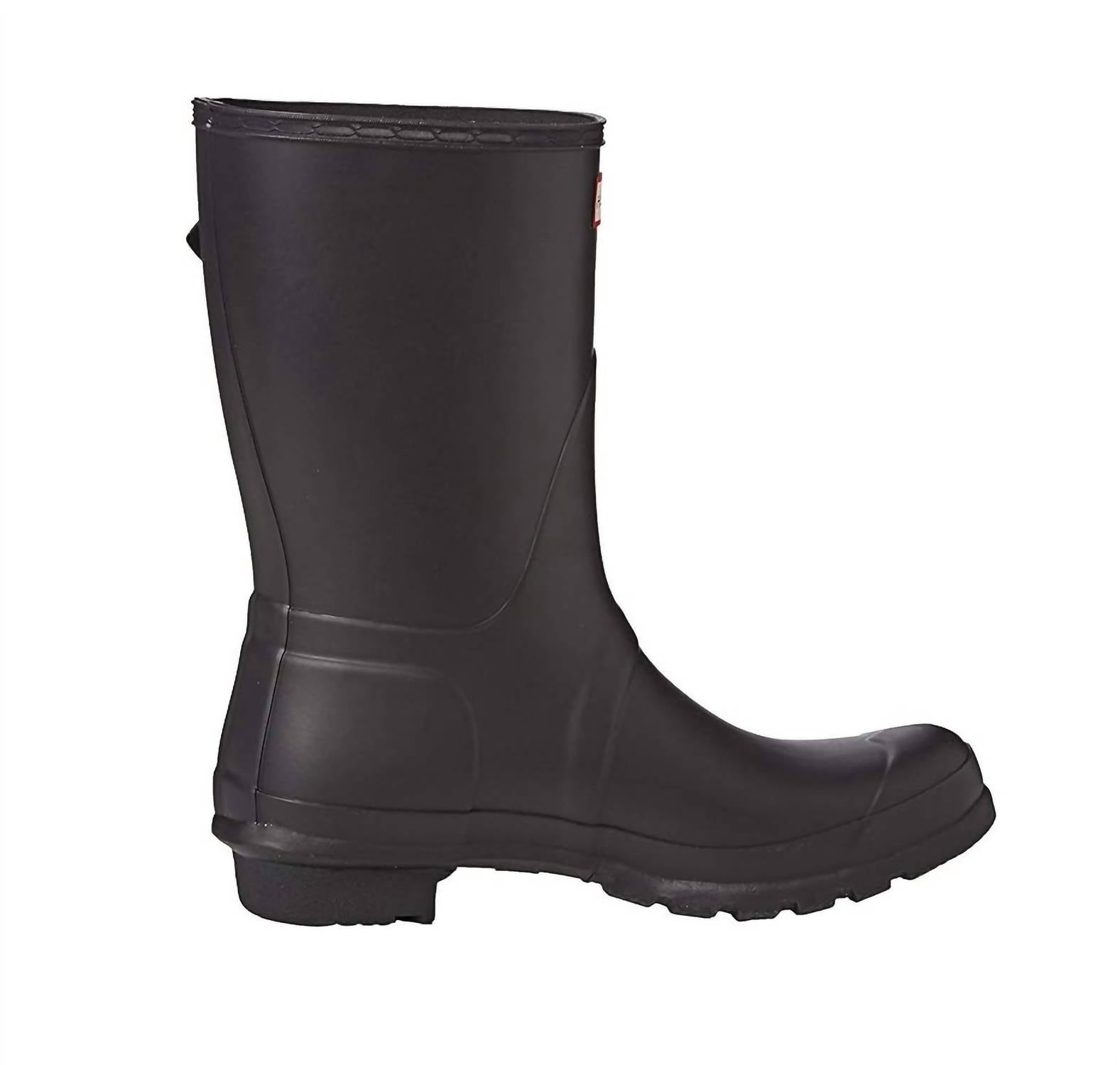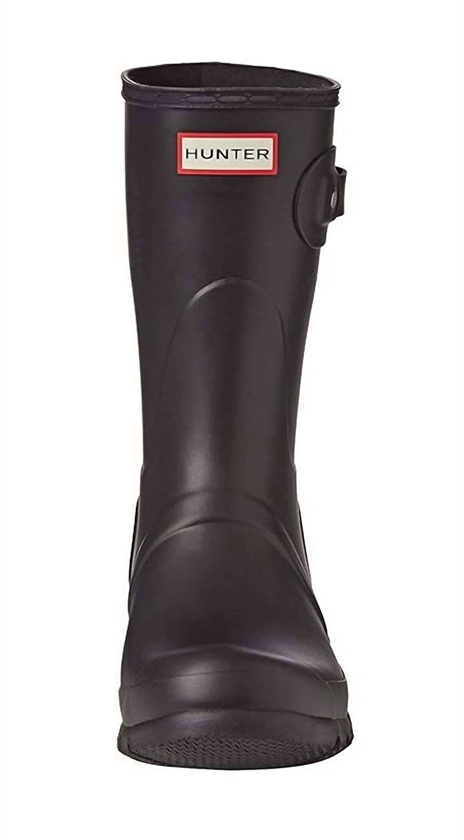 Rainboots so cute, you'll want to wear these even on the lightest drizzle days. The Women's Original Short Boot by HUNTER offers iconic style adapted for all wet-weather conditions. Crafted from 100% rubber, this black boot boasts a medium width and flat heel, ensuring both durability and comfort. Its round toe design is complemented by a 100% metal buckle, and the interior features a 100% recycled polyester lining for added comfort. Handcrafted to perfection, this waterproof boot is a quintessential choice for any wardrobe.