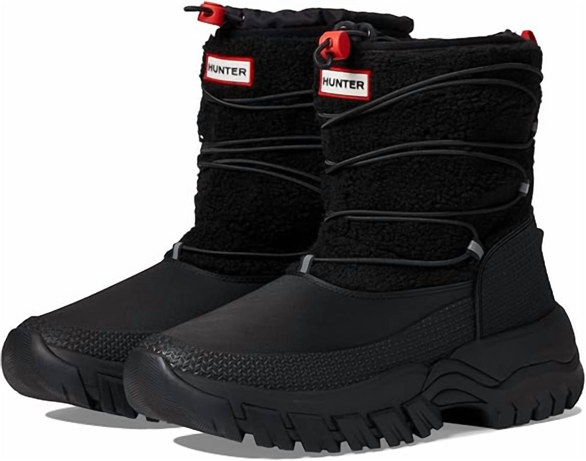 Introducing the Women's Wanderer Short Sherpa Snow Boot by HUNTER, the perfect companion for winter adventures. Crafted from durable rubber, these boots are designed to keep your feet warm and dry in winter's harshest conditions. Ideal for adult women seeking both style and functionality, these boots come in a versatile black hue. Perfect for any winter or rainy day, they're a staple addition to your cold weather wardrobe.
