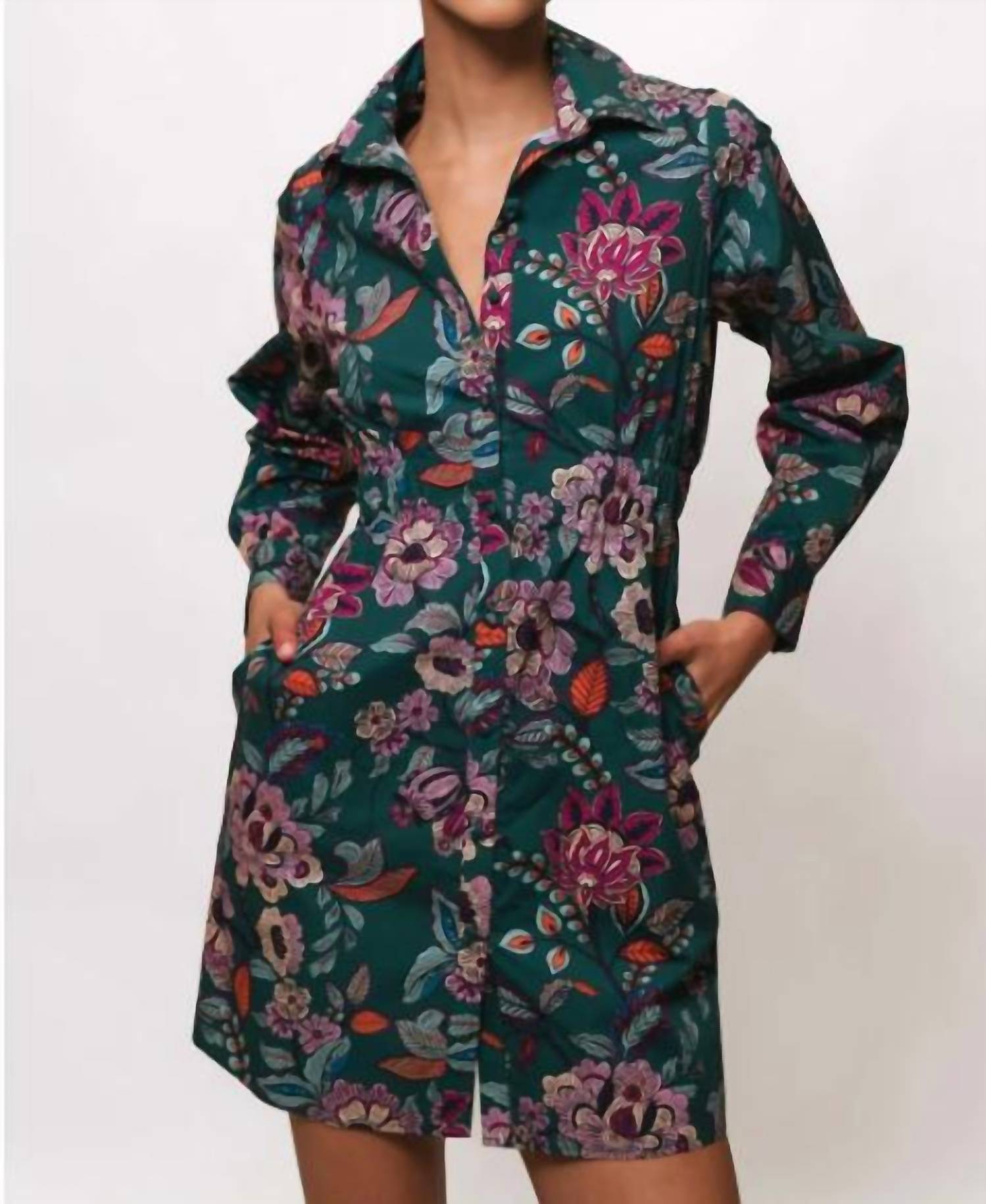 The Anja Dress by Hutch infuses vibrant style with its teal multi-floral print, making it a standout addition to any wardrobe. This women’s mini dress features long sleeves and a classic collar on a cotton poplin fabric, ensuring comfort and breathability. It is designed with a button closure and an elastic waist for a flattering sheath silhouette. With a garment length of 34" at the center front and 34.5" at the center back, this piece is perfect for a chic look. Care: Dry clean only.