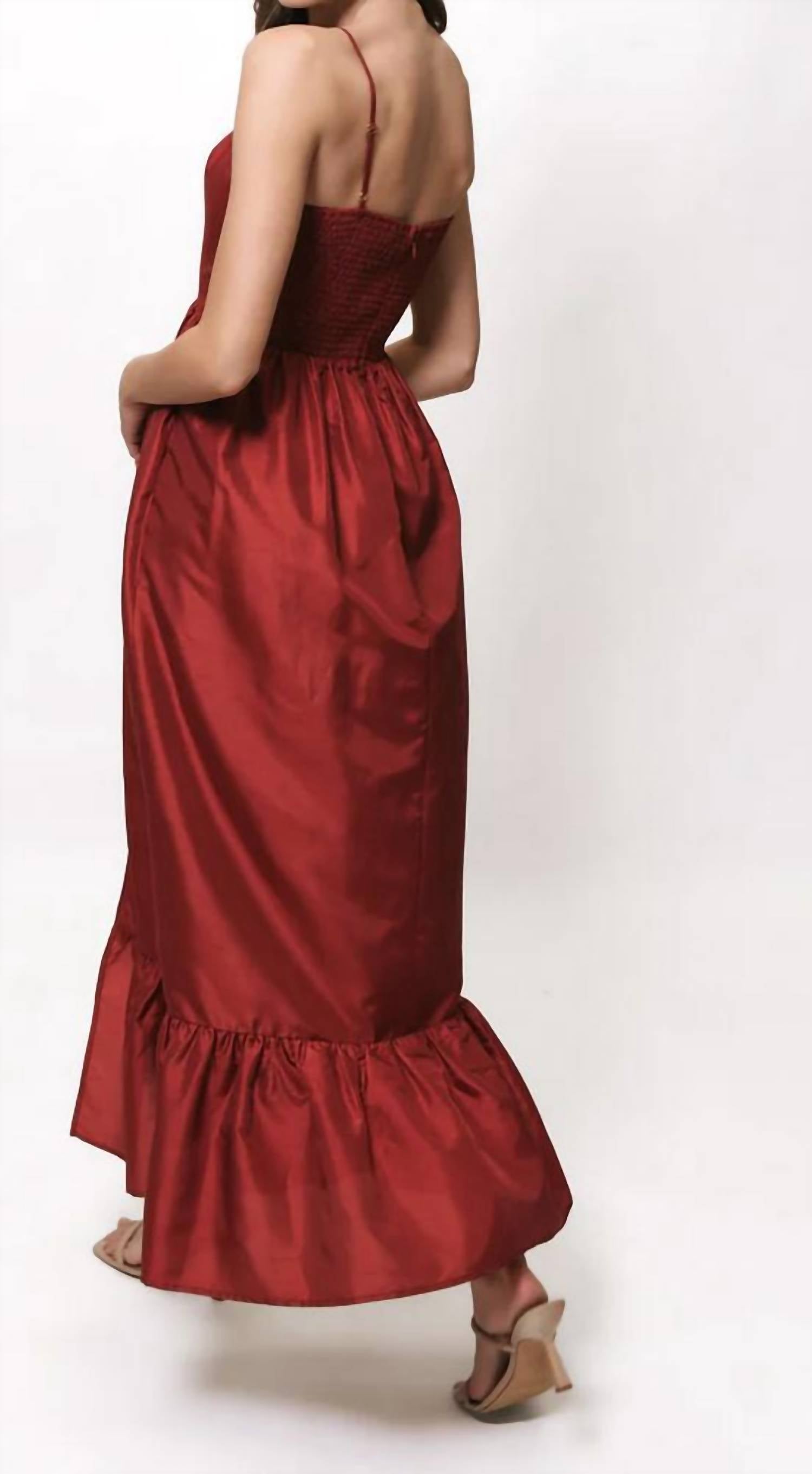 Who doesn't love a good maxi dress? This one you'll be reaching for season after season. Introducing the Carmichael Dress by Hutch, a stunning fit and flare maxi dress in a solid brick hue, perfect for special occasions. This dress features delicate spaghetti straps, a scoopneck, and a full skirt with a ruffled hem for a touch of elegance. Made from 100% polyester with a soft lining, it is finished with a smocked back and a concealed back zipper closure. For optimal care, dry clean only. Imported for exceptional quality.