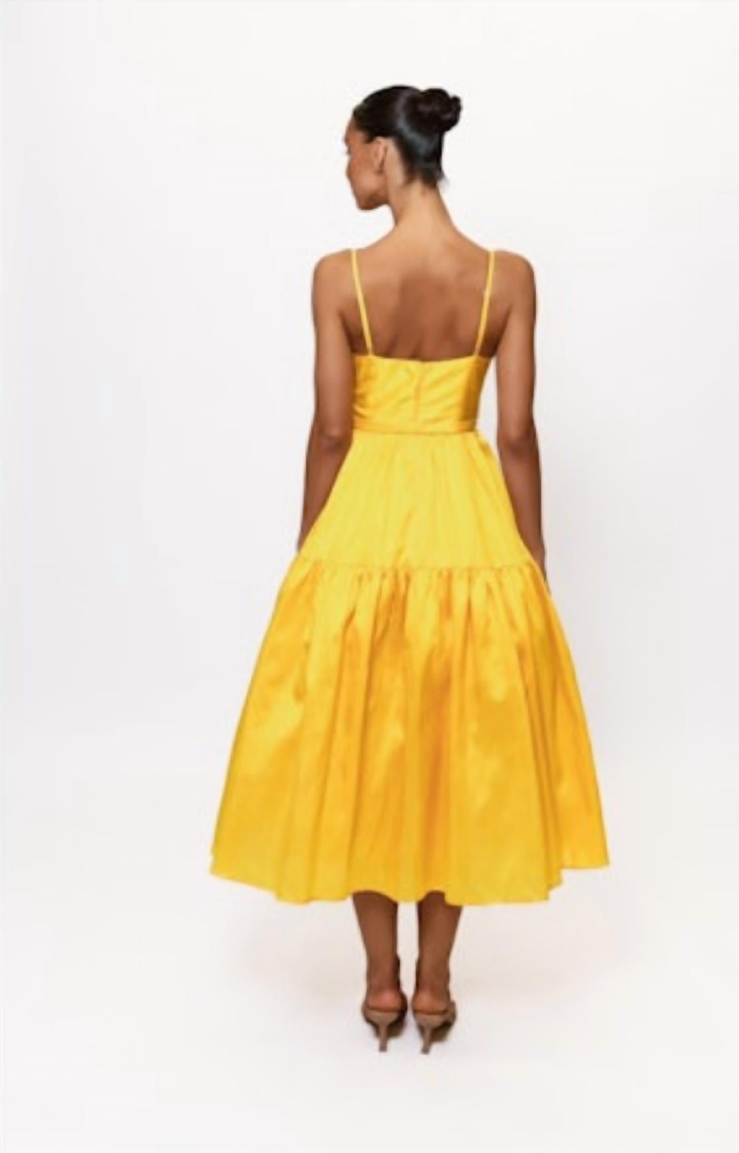 Introducing the Hutch Atherton Midi Dress in vibrant Daffodil, a statement-making piece perfect for holiday parties. This midi dress features adjustable spaghetti straps and a V-neckline, adding a touch of elegance. Crafted from 100% polyester with a tiered A-line skirt, it includes an adjustable belt and an invisible back zip for a flattering fit. Falling 51" from the shoulder, this imported dress requires dry cleaning to maintain its luxurious look.