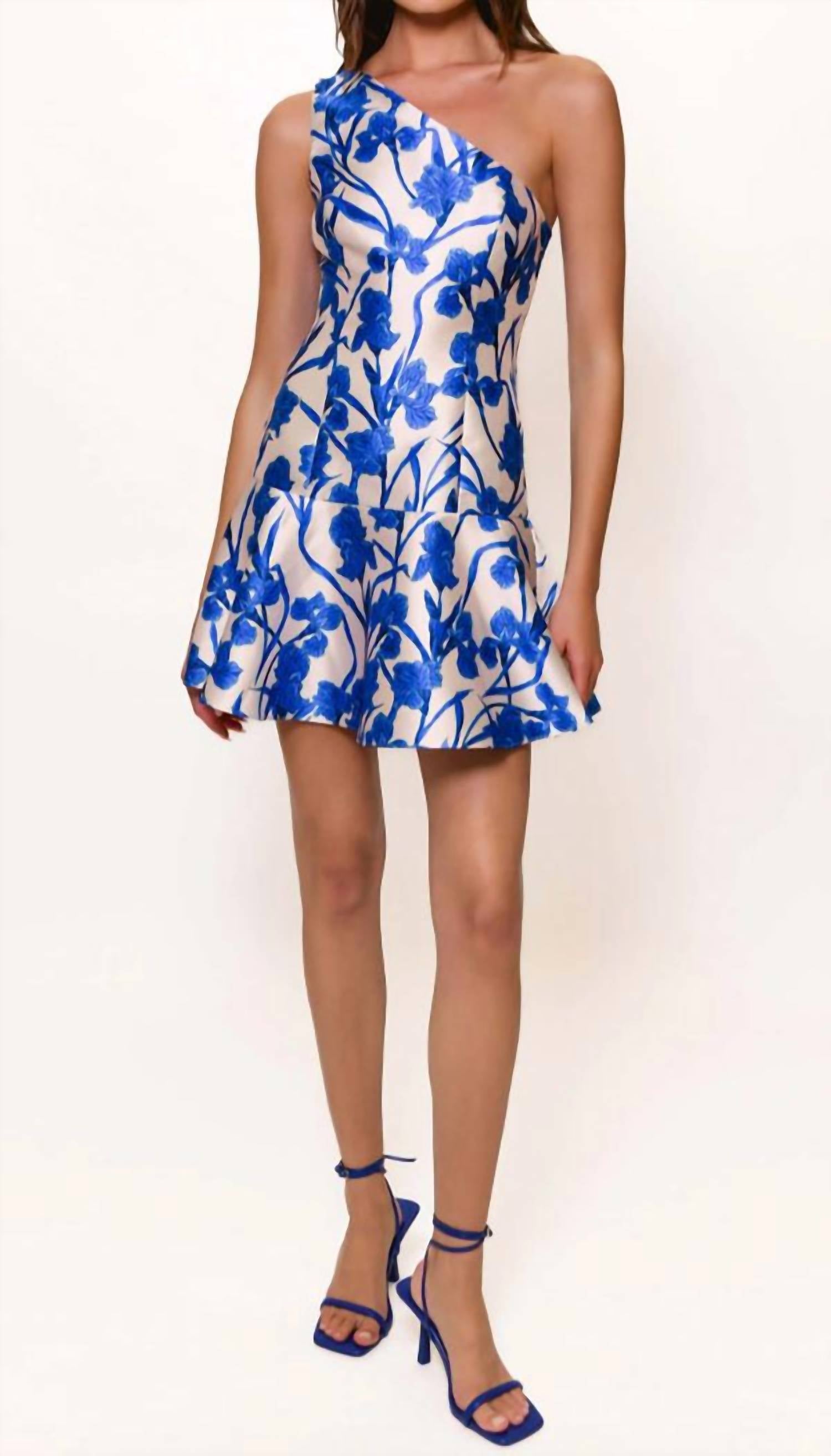 Unveiling the Hutch Silas Dress in striking cobalt, a boho-chic piece ideal for summer engagements. This one-shoulder, sleeveless mini dress features a fit and flare silhouette with a floral pattern, crafted from chiffon, and measures 34" from the high point shoulder. Its lined design ensures comfort, secured with a discreet side zipper closure for easy wear. Care for this garment by dry cleaning only.