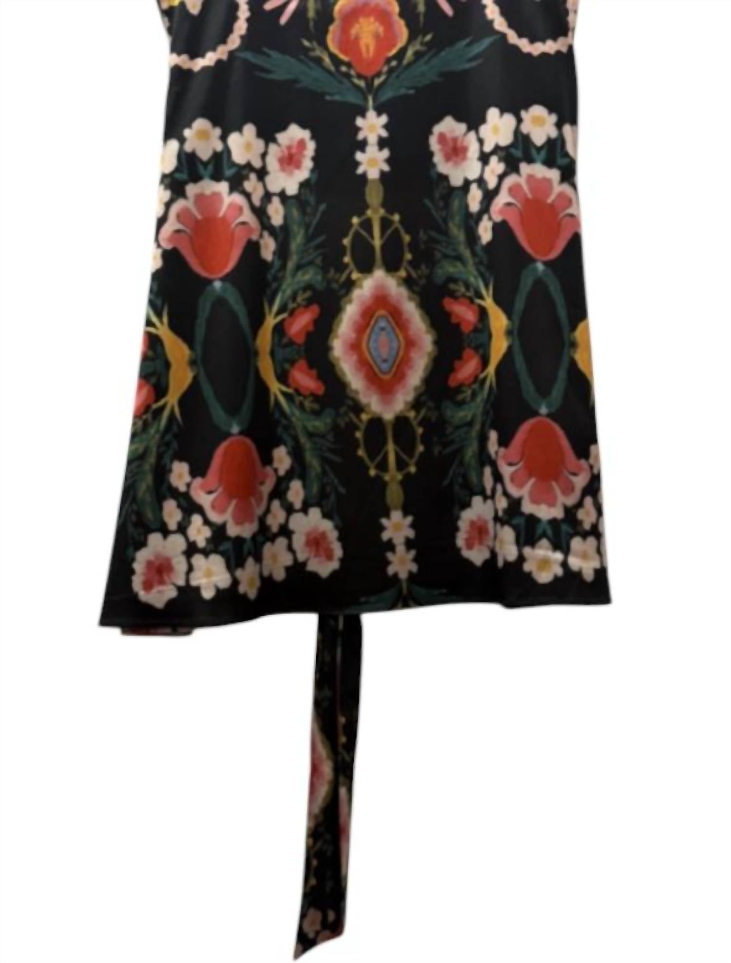 Embrace the bohemian chic vibe in Black Mirror Floral. Sleeveless top boasts a vibrant array of red, pink, and white floral motifs on a predominantly black background, enhanced by ornate abstract patterns that add an eye-catching element. Features a round crewneck with a tie detail at the bottom hem, perfect for a touch of playful styling. Designed for effortless elegance. Pull-on piece. Requires hand washing to maintain its intricate beauty, making it a great choice for holiday parties and spring gatherings.