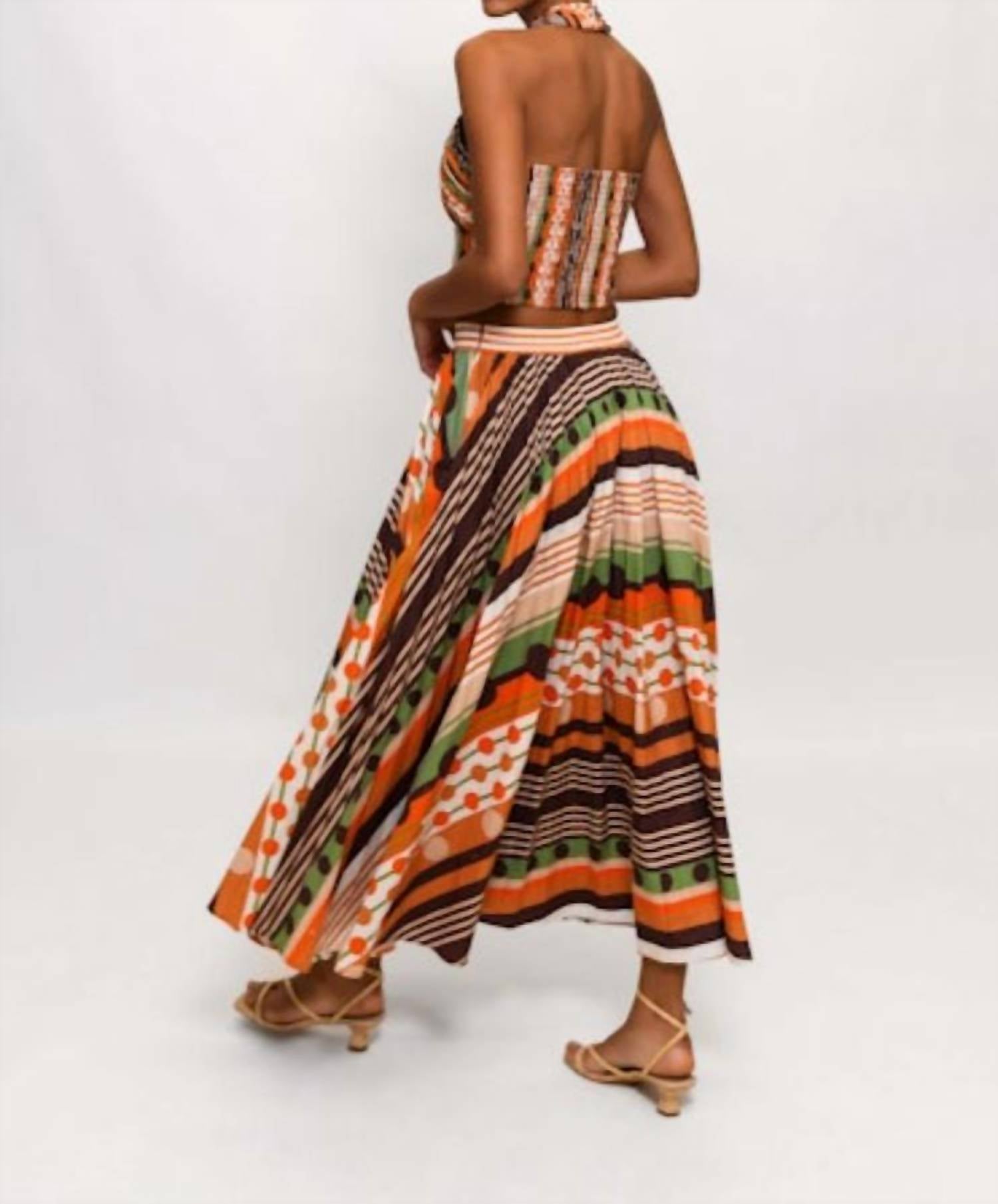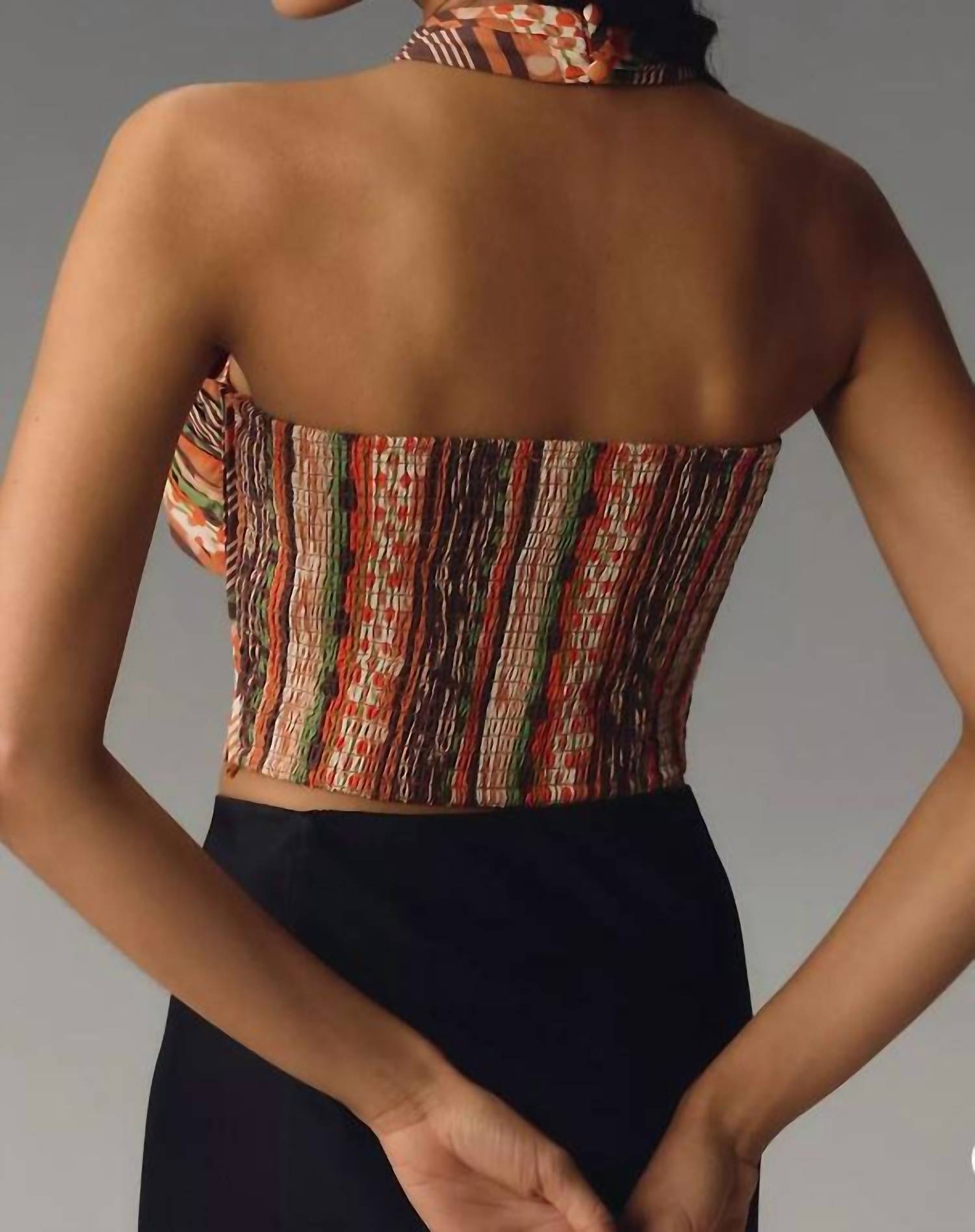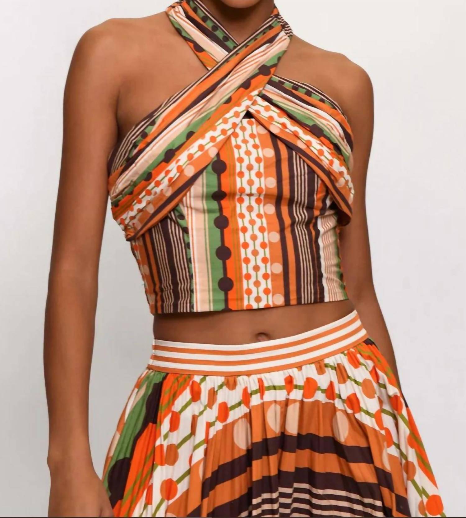 Show a little skin in this cute and casual crop top. Introducing the Suri Top by Hutch, a stunning sleeveless crop top designed to make a statement. Crafted from polyester, this 18" length piece showcases a bold geometric pattern in a lively multi-color palette. The top features a halter neckline and a side zip closure, ensuring a sleek fit. Care for this imported piece with dry cleaning to maintain its luxe appeal.