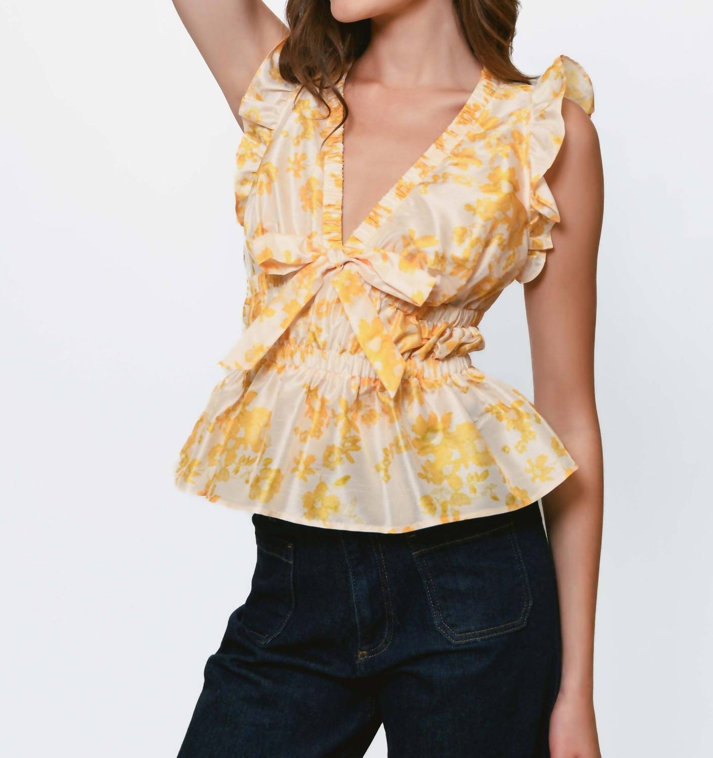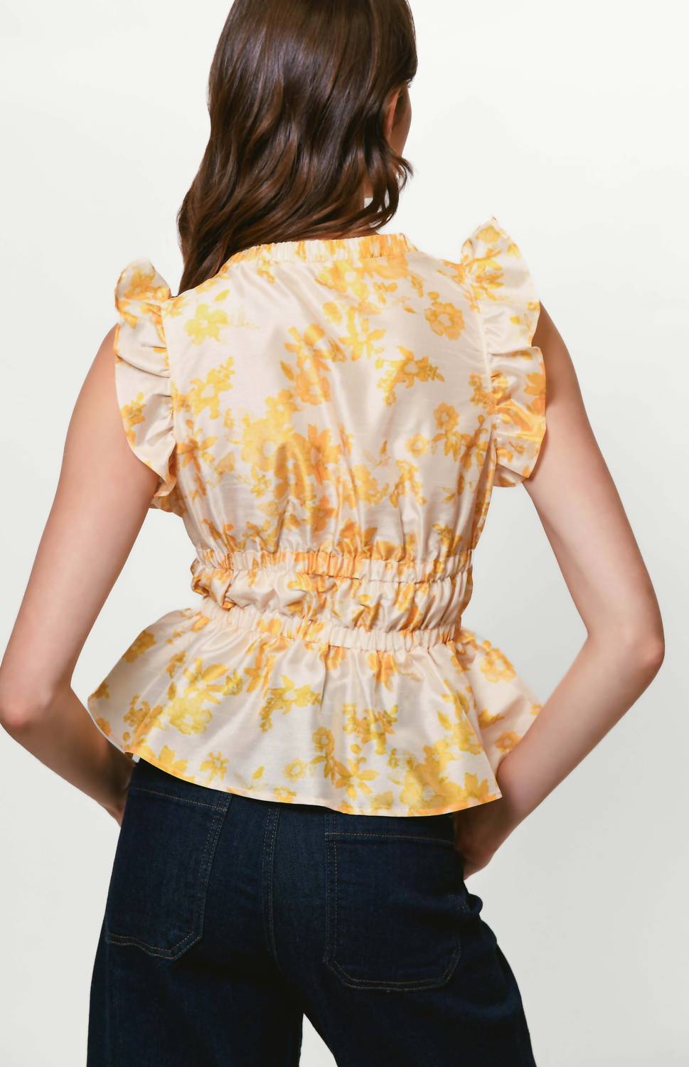 Embrace boho chic style with the Tazz Daisy Top by hutch in Champagne Dainty Floral. This flutter and cap sleeve blouse features a peplum design with a ruched waist accented by a charming bow detail, finished with a delicate v-neckline. This floral piece is fully lined for comfort and convenience with a pull-on closure. Care instructions: dry clean only.