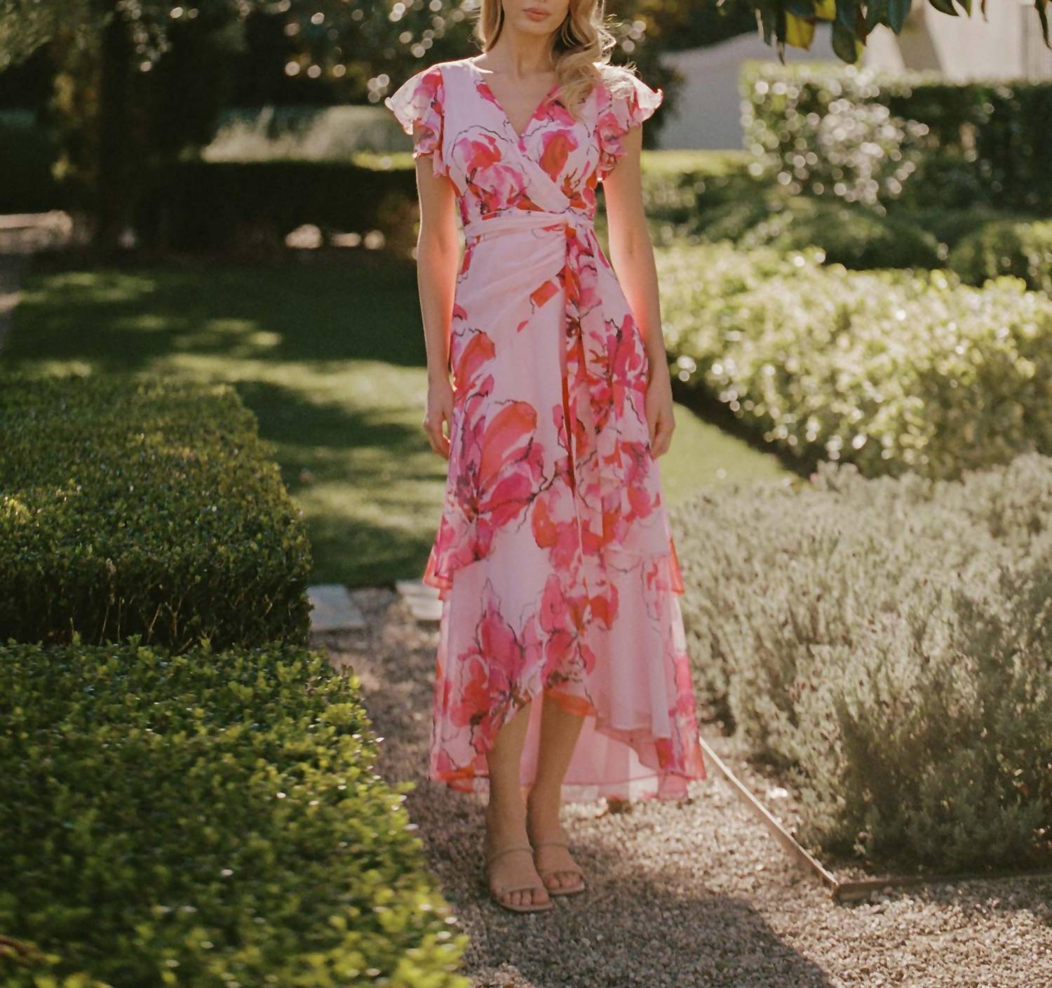 Introducing the Cezza Dress by Hutch, a perfect floral chiffon creation for summer weddings. This casual fit-and-flare maxi wrap dress features cap sleeves and a flattering V-neckline. The tiered skirt adds elegant movement, with a length of 45.5" at the front and 58.5" at the back for standard sizes, and 48" at the front and 61" at the back for plus sizes. Crafted with care, this dress is dry clean only.