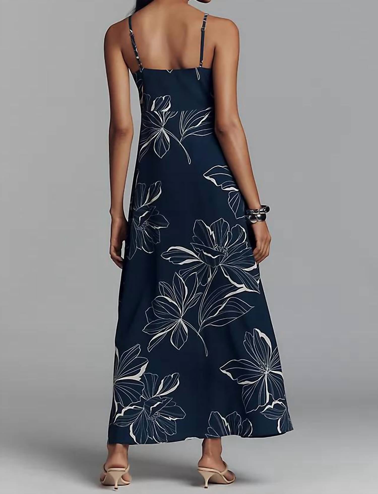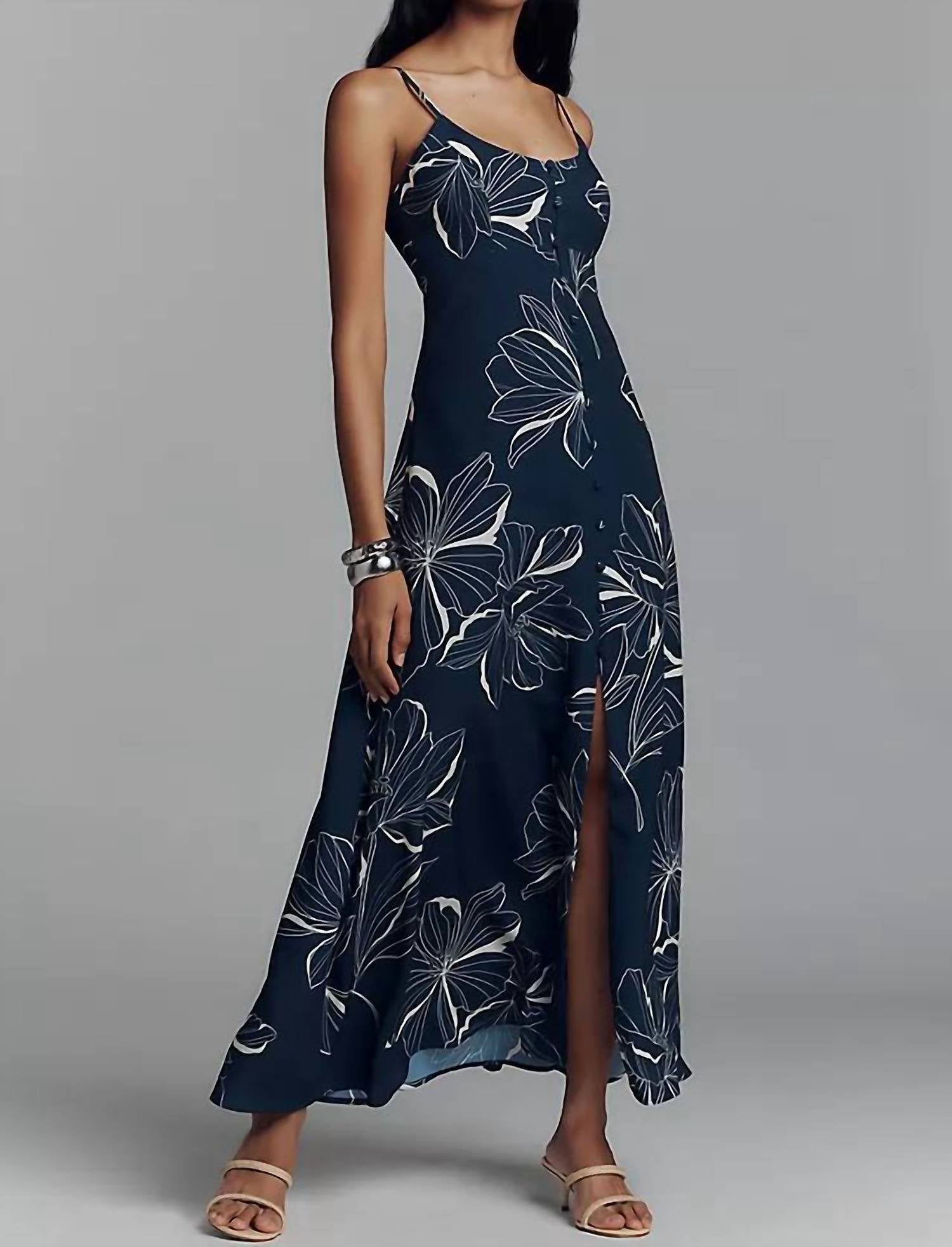 Elevate your vacation wardrobe with the Valente Floral Maxi Dress by Hutch, a stunning A-line silhouette designed for effortless elegance. This dress features delicate spaghetti straps, a scoopneck, and a stylish button closure. Crafted from 100% Polyester, this navy floral piece is perfect for embracing Boho Chic vibes throughout the spring. To ensure longevity, dry clean only.