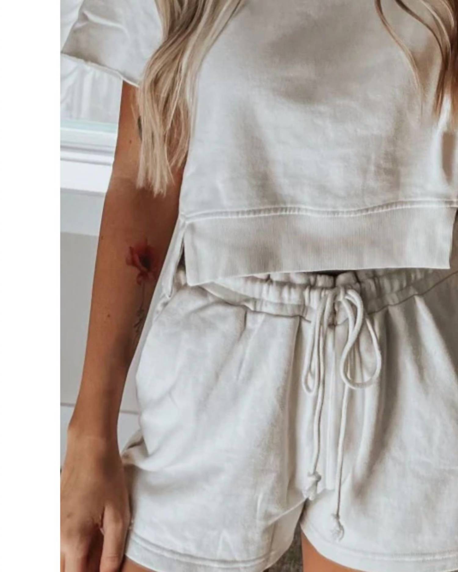 A match made in heaven. This two-piece set is so cute, you'll wish you could wear it out of the house! Did we mention how comfortable it is, too? You may want two sets! Introducing the Basics Kinley Set by HYFVE, crafted for understated elegance and comfort in the solid Alpaca color. This women's loungewear set features a top with a round neckline, short sleeves, and a boxy bodice, paired with shorts that include a drawstring waist, flowy legs, and a mini hem. Made from a high-quality Cotton Blend, the composition is 88% Cotton and 12% Polyester. Care instructions: Machine wash cold and tumble dry on low. Model is 5'10" and is wearing a size small.