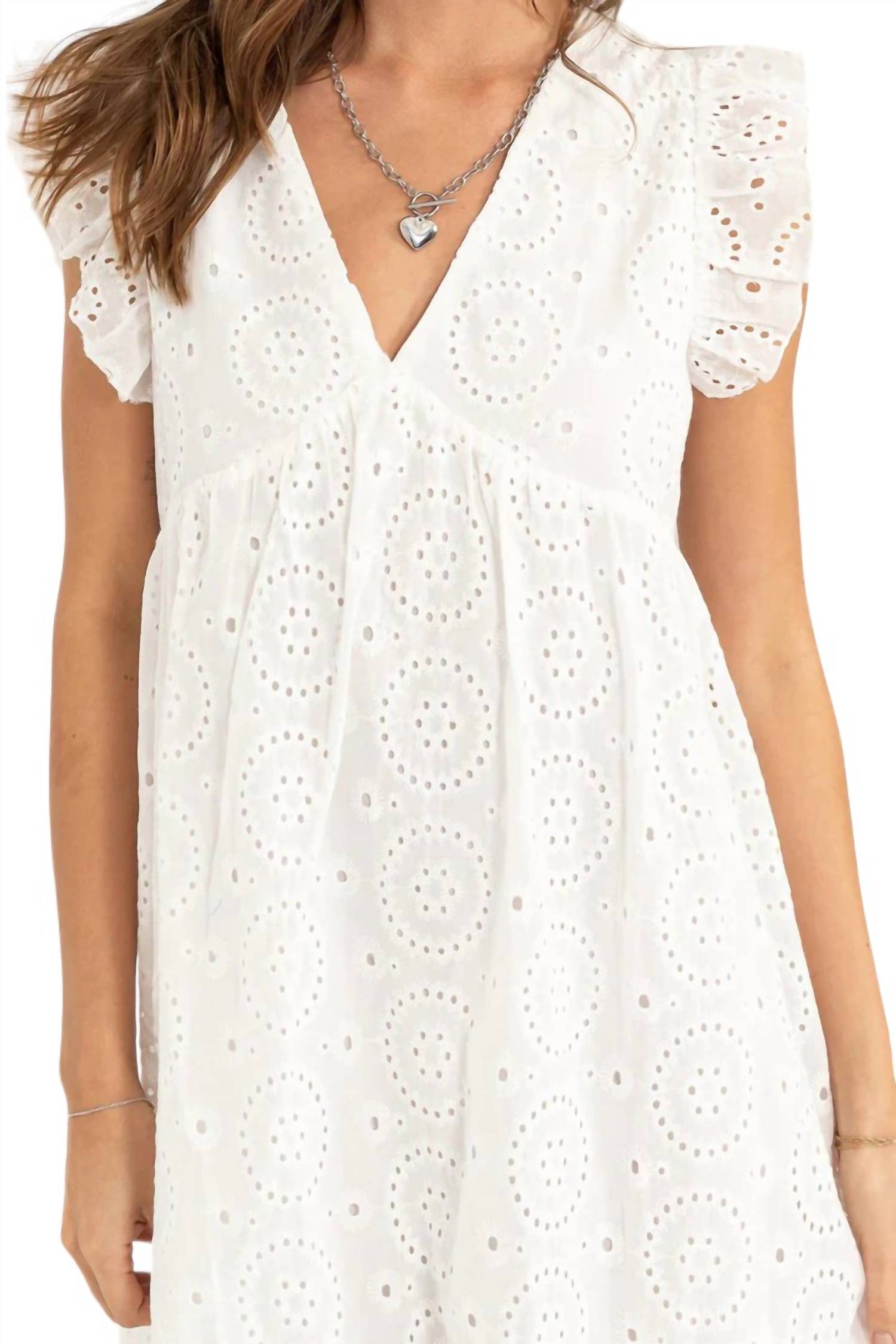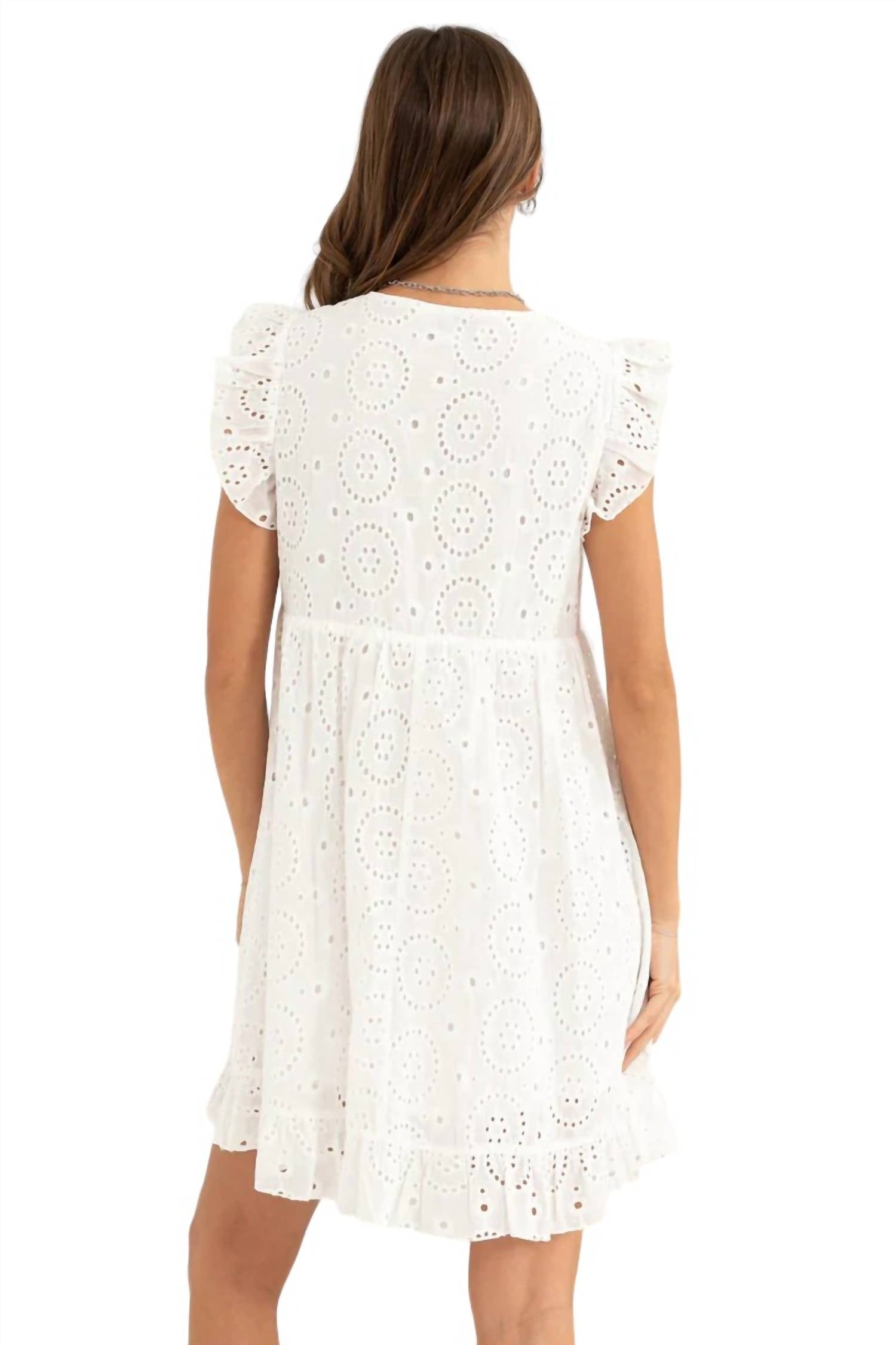 A short and breezy dress for those warmer days.This Easy On Me Cotton Eyelet Mini Dress is crafted from eyelet-embroidered 100% Cotton, Lining 100% Polyester with ruffled cap sleeves and a V-neckline. It features an empire waist and a flared, fully lined skirt with a frill trim. Perfect for casual outings. Care instructions: machine wash cold.