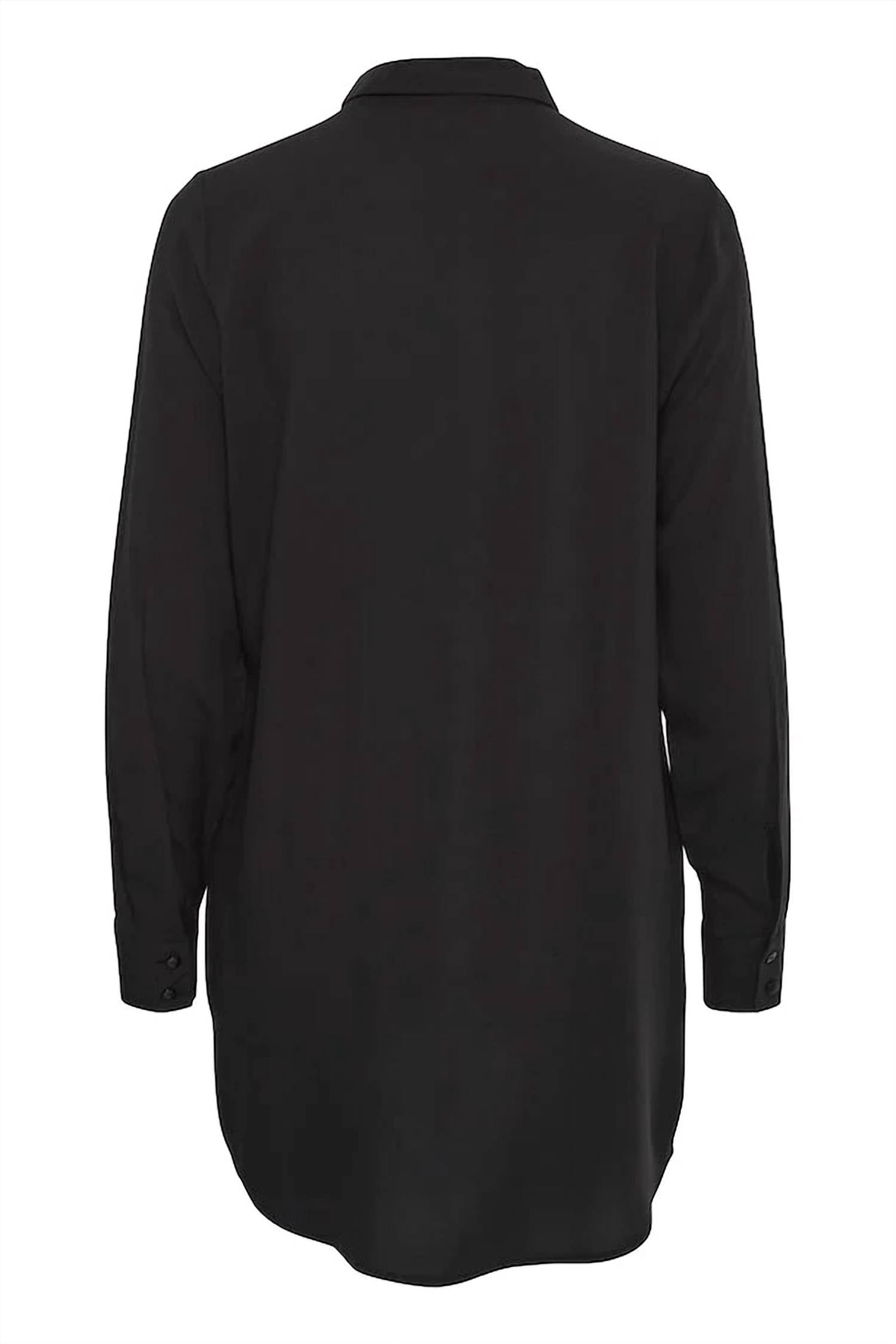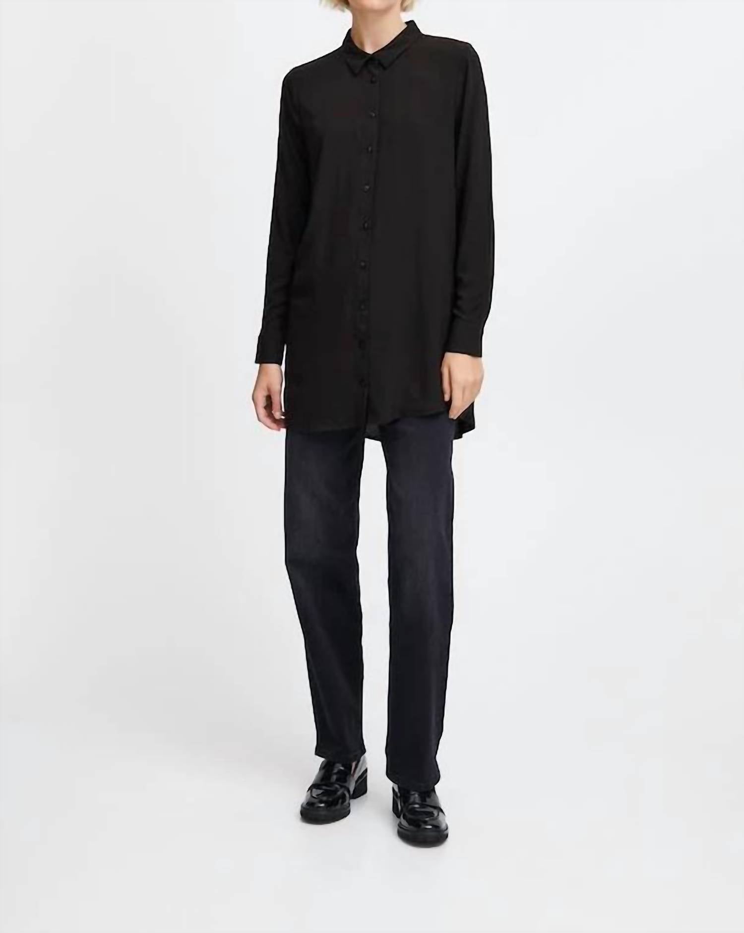 Introducing the Long Sleeve Button Down Shirt by ICHI, designed for women seeking elegance and versatility. This shirt features long sleeves, a solid black color, and a classic collar for a timeless look, with a length falling below the waist. Made from 100% viscose, it ensures a soft touch and effortless maintenance. Closure: Button closure. Care: Machine wash. Perfect for workwear and any occasion.