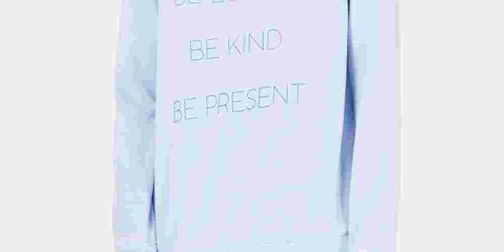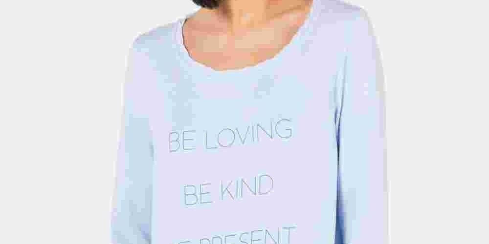 Hits at hip; semi-fitted|INSPIRED FOR: Athleisure|Scoop neckline; long sleeves with thumbholes; "Be Loving, Be Kind, Be Present" graphic at front|Cotton/polyester