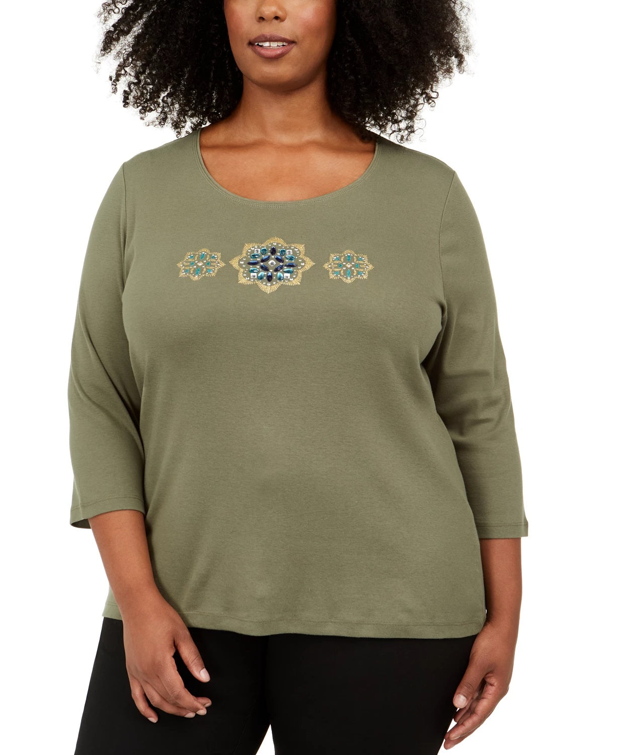 Approx. model height is 5'10" and she is wearing size 1X|Relaxed fit; approx. 28" long|Scoop neckline|Sequined flowers at chest|3/4-sleeves|All cotton
