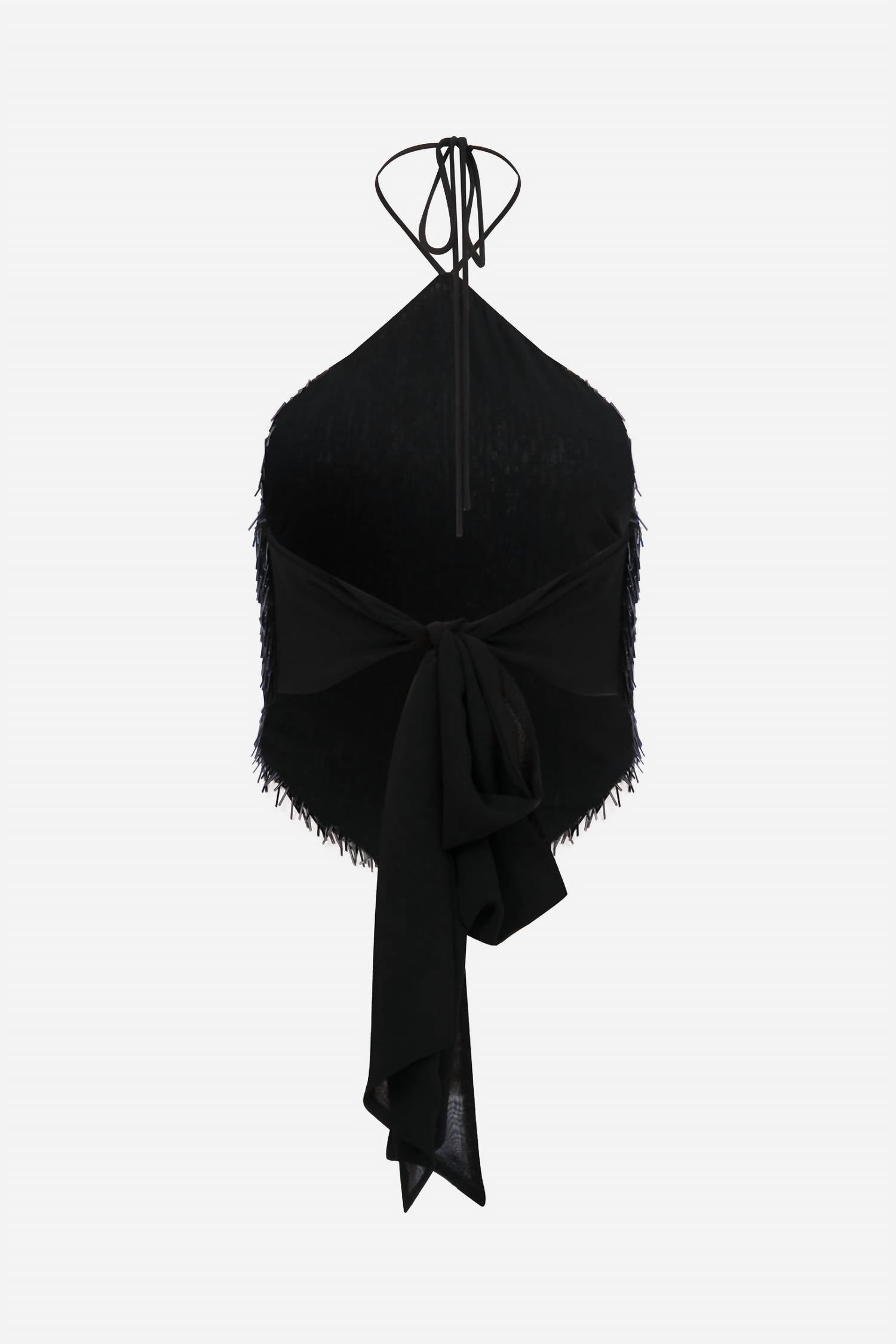 This classic tank top is perfect for layering and cute enough to wear on its own. Presenting the Alexa Bandana Sequin Top by ILA, a stunning black tank top perfect for making a statement. This piece features spaghetti straps and a stylish halter neckline, adding a touch of glamour with its sequined design. Made from 100% polyester, the top measures 18 inches in length and offers a tie closure for a secure fit. Care for this garment by adhering to dry clean only instructions.