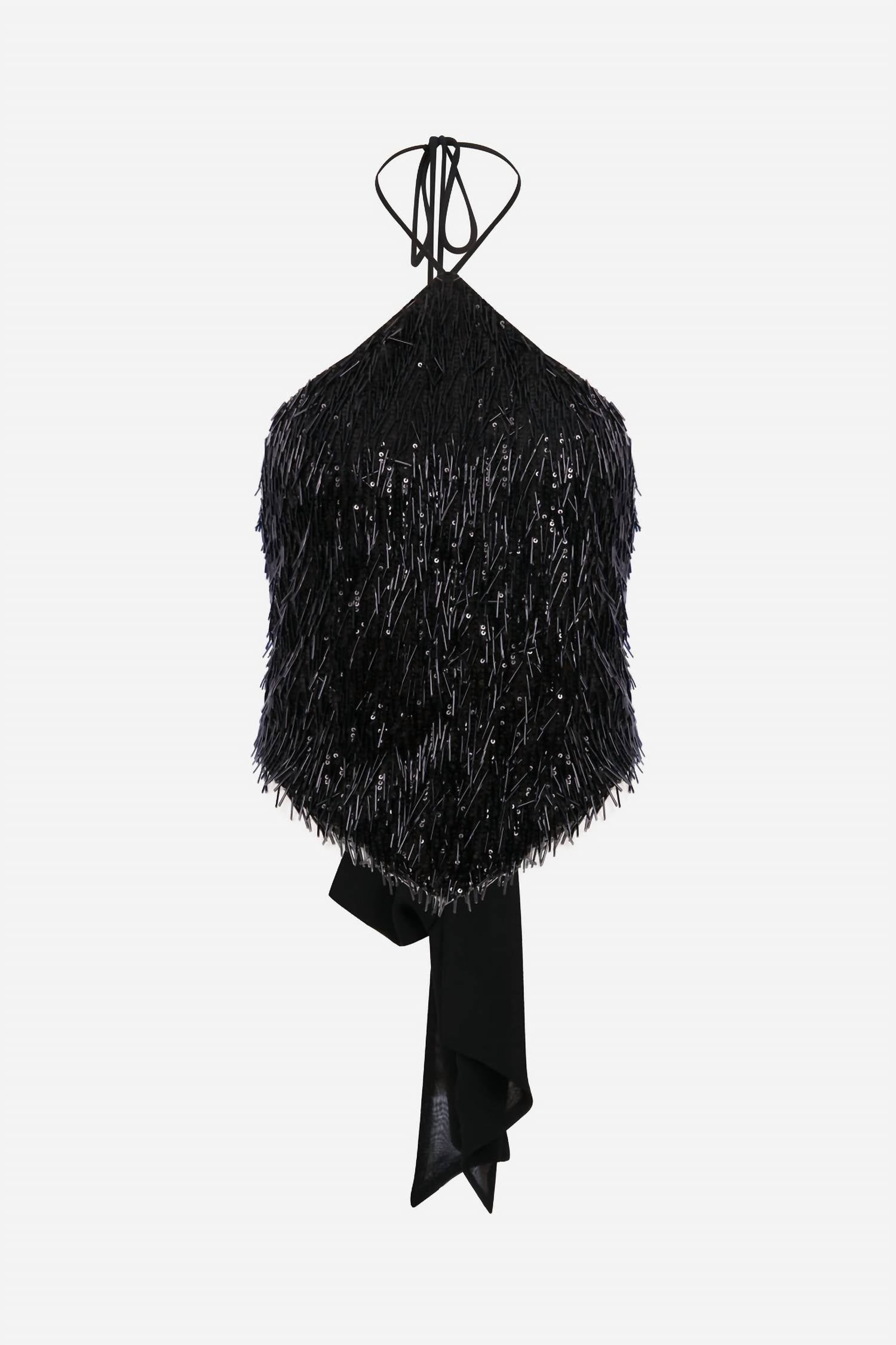 Presenting the Alexa Bandana Sequin Top by ILA, a stunning black tank top perfect for making a statement. This piece features spaghetti straps and a stylish halter neckline, adding a touch of glamour with its sequined design. Made from 100% polyester, the top measures 18 inches in length and offers a tie closure for a secure fit. Care for this garment by adhering to dry clean only instructions.
