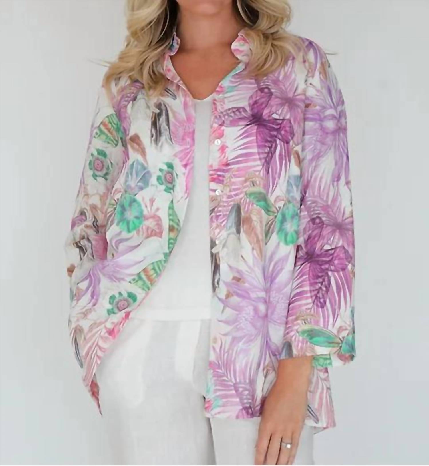 A classic button down shirt that will never go out of style. The Women's Classic Button Down Top by iLinen is your go-to for vacation-ready style. With long sleeves and a delightful floral watercolor print, this top is crafted from 100% organic European linen, offering a comfortable loose fit. It features practical side pockets and a V-neck neckline, all in a chic Flowers & Butterflies design. Closure: Button closure. Origin: Made in Europe. Care: Machine wash. The model is 5'8", size 6, and wears size M for a looser fit.
