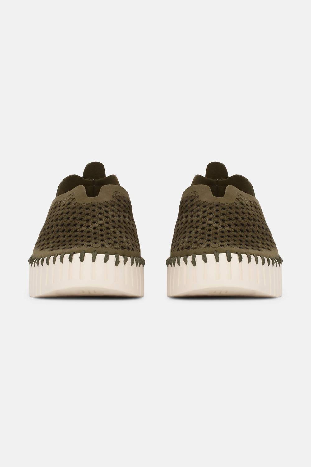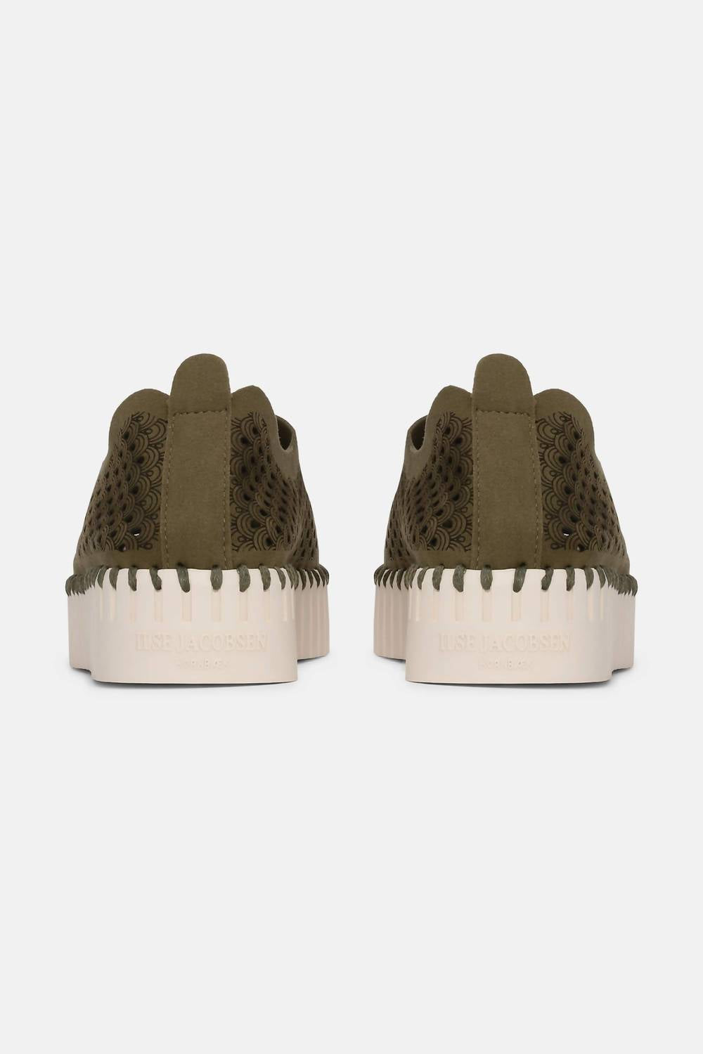 A classic loafer that is both comfortable and polished. Step up your style game with the Women's Platform Tulip Slip-on by Ilse Jacobsen in an elegant Deep Olive shade. These flats feature a recycled microfiber upper with intricate laser-cut details and a modern platform Tulip outsole offering a low heel height of 1 1/4"-2". The design ensures comfort and ease with a glue-free construction stitched using color-matched recycled thread, all while providing support through a softly padded insole with arch cushioning. Composition includes a 60% Nylon, 40% Polyurethane upper, while the outsole is made from 75% Natural Rubber, 25% Recycled Rubber, and the insole combines 60% EVA with 40% Pig Suede.