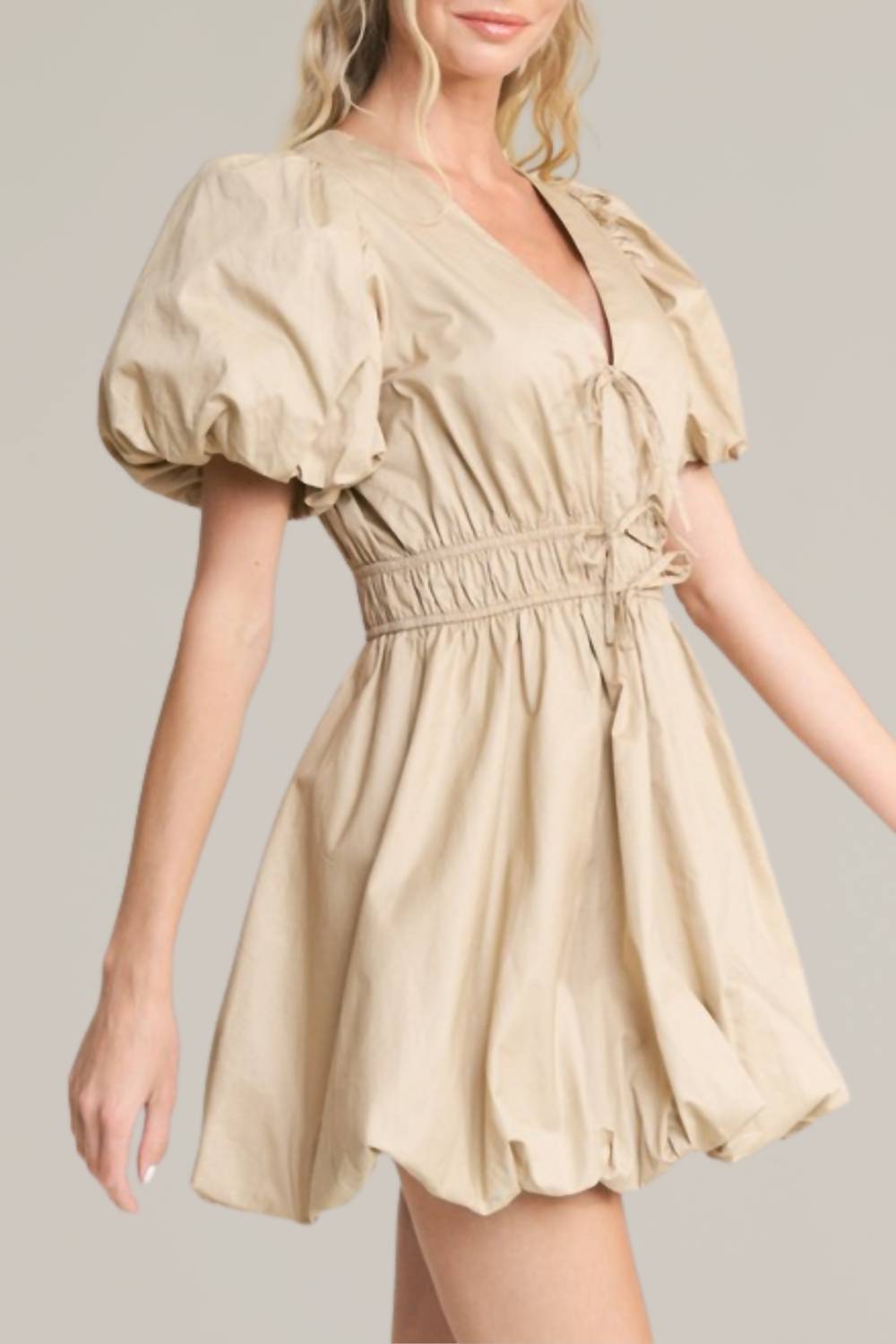 The kind of easy and flattering dress you'll be reaching for all season long. Experience effortless style and comfort with the Bubble Hem Tie Front Mini Dress by In The Beginning. This khaki dress features short sleeves and a unique bubble hem, complemented by a zip closure for ease. It's made from 100% cotton, ensuring breathability and comfort. Care instructions advise hand washing and line drying to maintain its fit and flare silhouette. Model is wearing a size small and measures 5'10".