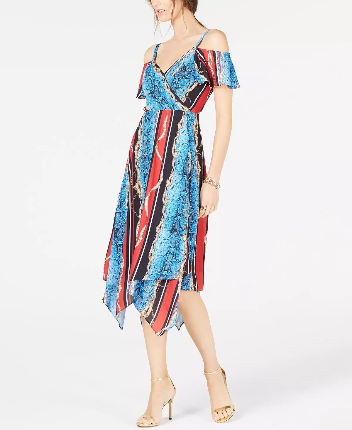 Designed to fit and flatter 5'4 and under frame|Surplice neckline; A-line silhouette|Center back zipper closure|Cold-shoulder cutouts; handkerchief hem|Polyester; trim; polyester; lining; polyester|Machine washable
