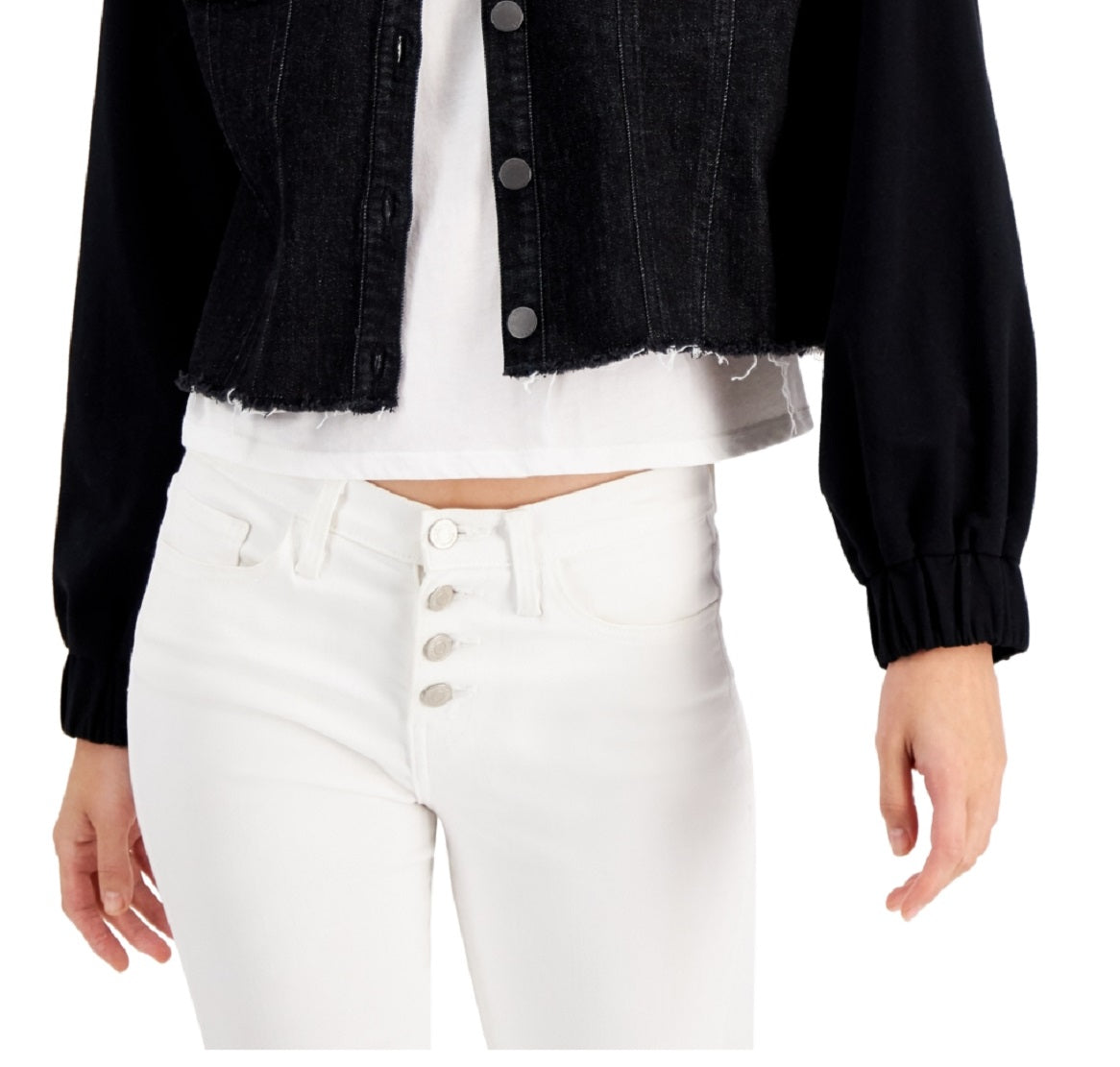 INC International Concepts®' denim trucker jacket gets a cozy update with soft French terry sleeves for a chic mixed-media design.| Cropped length| Point collar; front button closures| Two button flap pockets at chest| Long French terry sleeves| Unlined|