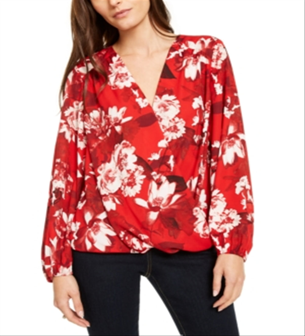 INC International Concepts Women's Red Floral Print Surplice Top Size Petite Small
