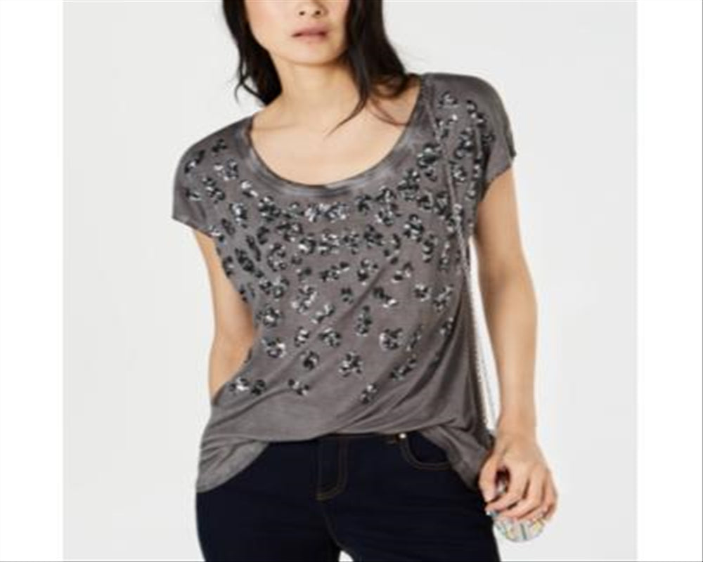INC International Concepts Women's Sequined Animal Print Pullover Top Gray Size Small
