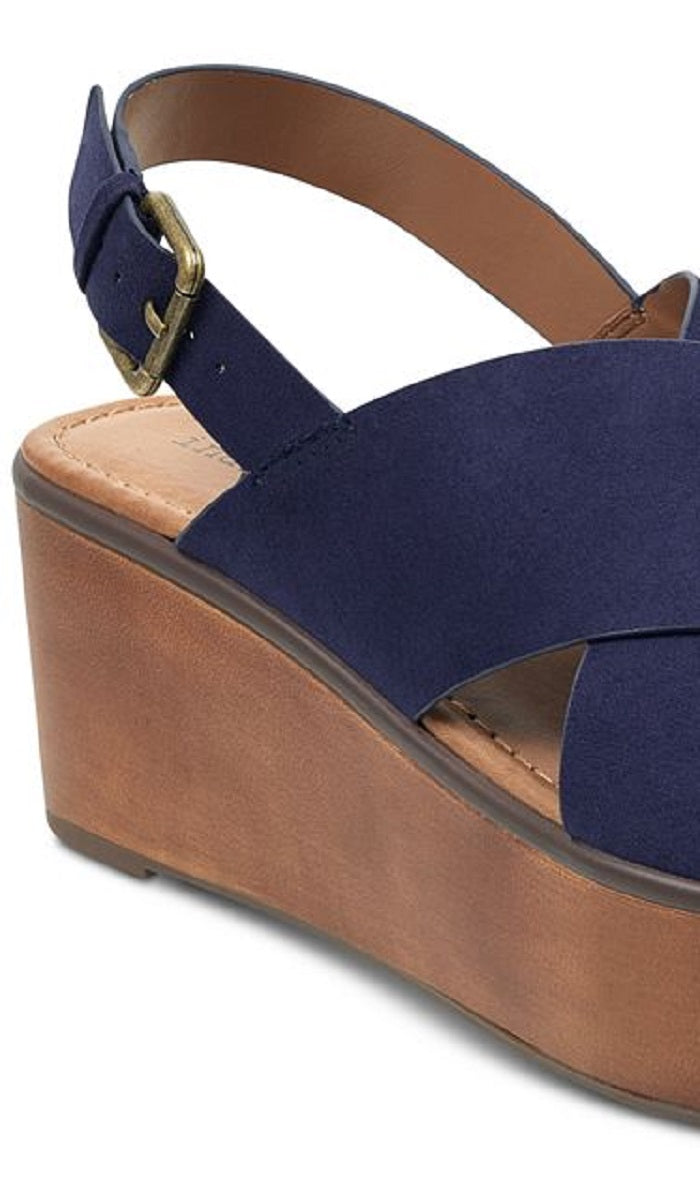 Round-toe platform wedge sandals with buckle closure| Crisscross vamp straps; sling back| Manmade upper; manmade sole