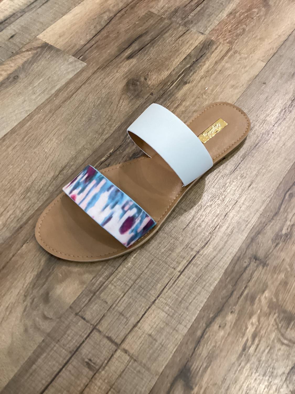 Classicly cute and all-day-wearable. We love this sandal. Step into style with the Insignia Two Strap Tie Dyed Sandals, featuring a vibrant Blue/Fushia color palette. Made from durable faux leather, these sandals are designed for women seeking both comfort and flair. The slip-on style is paired with an open rounded toe and printed strap detailing for a playful touch. Boasting a flat heel under 1", they come with a lightly padded insole, making them a perfect choice for everyday wear.