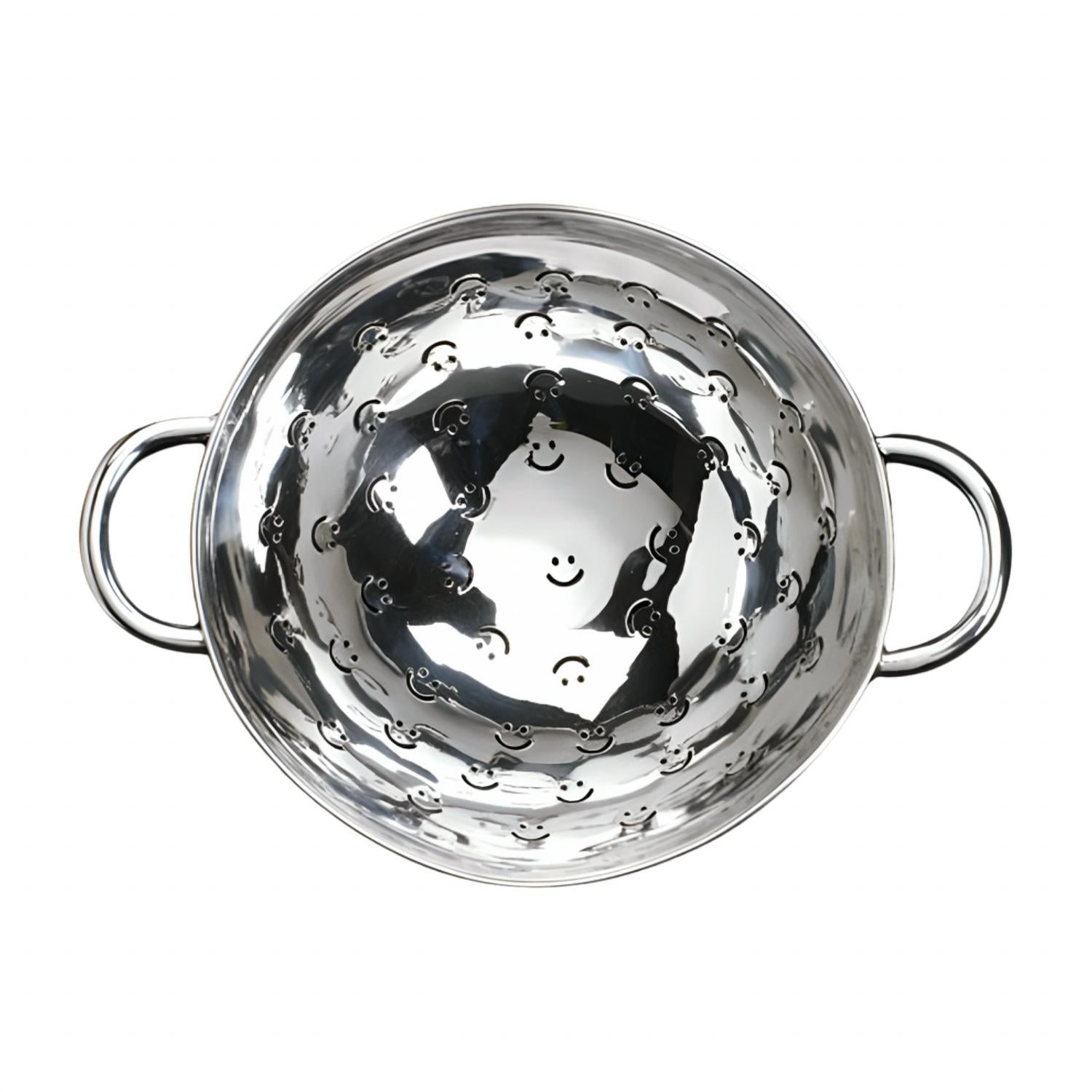 Brighten up your kitchen tasks with the Berry Happy Bowl by Inspired Generations, a stylish serveware item crafted in sleek silver stainless steel. Featuring playful smiley perforations, this colander makes straining a fun affair. Available in Small (8" x 6.5" x 3") and Large (11" x 8.5" x 3.75") sizes, it's handcrafted from food-safe, polished stainless steel. Add a touch of joy to your everyday routine with this innovative kitchen essential.