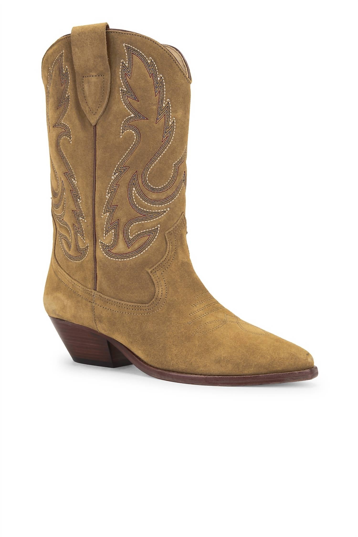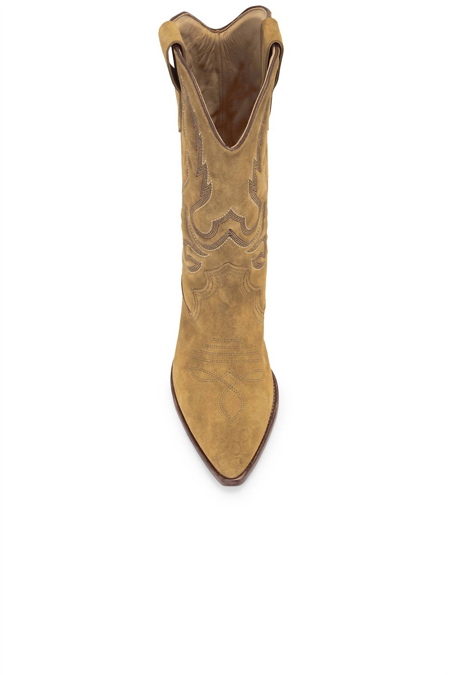 Say hello to the perfect, most versatile boot. The ankle height makes this style easily transition from day to night. Wear them with your favorite skinny jeans and tee for a more laid back look, or pair them with your favorite mini dress and jacket for a night out on the town. Step into style with the Women's Duerto Boot by Isabel Marant, a sepia-hued statement piece for your concert ensemble. Crafted with a luxurious suede upper and leather sole, this boot is made in Portugal and features a convenient pull-on styling with dual side pull-tabs. The Western-inspired stitching complements the pointed toe and wooden block heel, standing at approximately 50mm/2 inches. Finished with a leather footbed and lining, the shaft measures approximately 210mm/8.25 inches and 34 cm in circumference.
