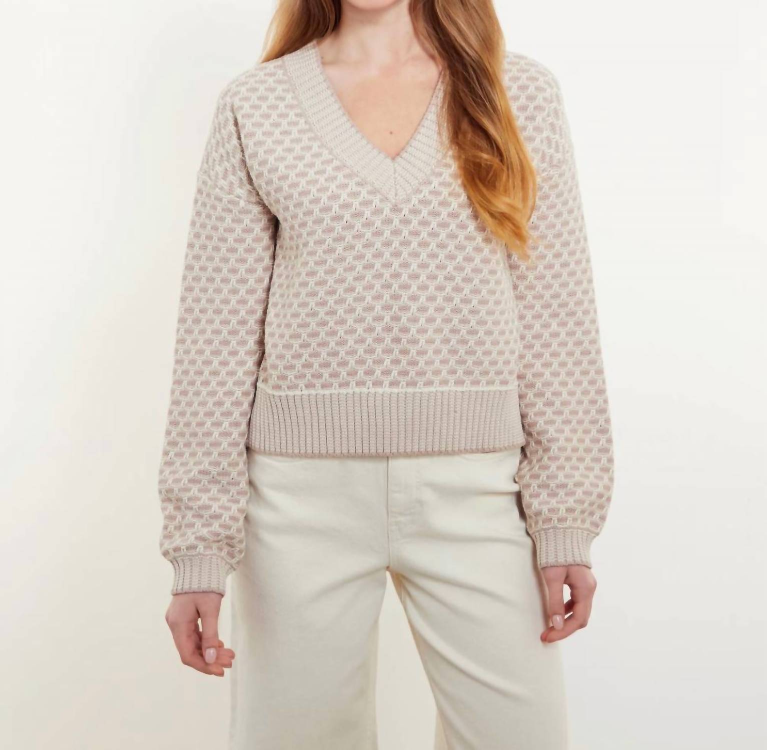 Embrace minimalist style with the Brynn Stitch V-neck Sweater by &Isla. Crafted with a textured viscose blend, this women's long sleeve sweater in a soothing latte/oatmeal hue offers a slightly cropped silhouette perfect for fall travel. Featuring a V-neckline and a convenient pull-on closure, it effortlessly combines comfort and elegance. Care for this piece by hand washing and laying it flat to dry for long-lasting wear.