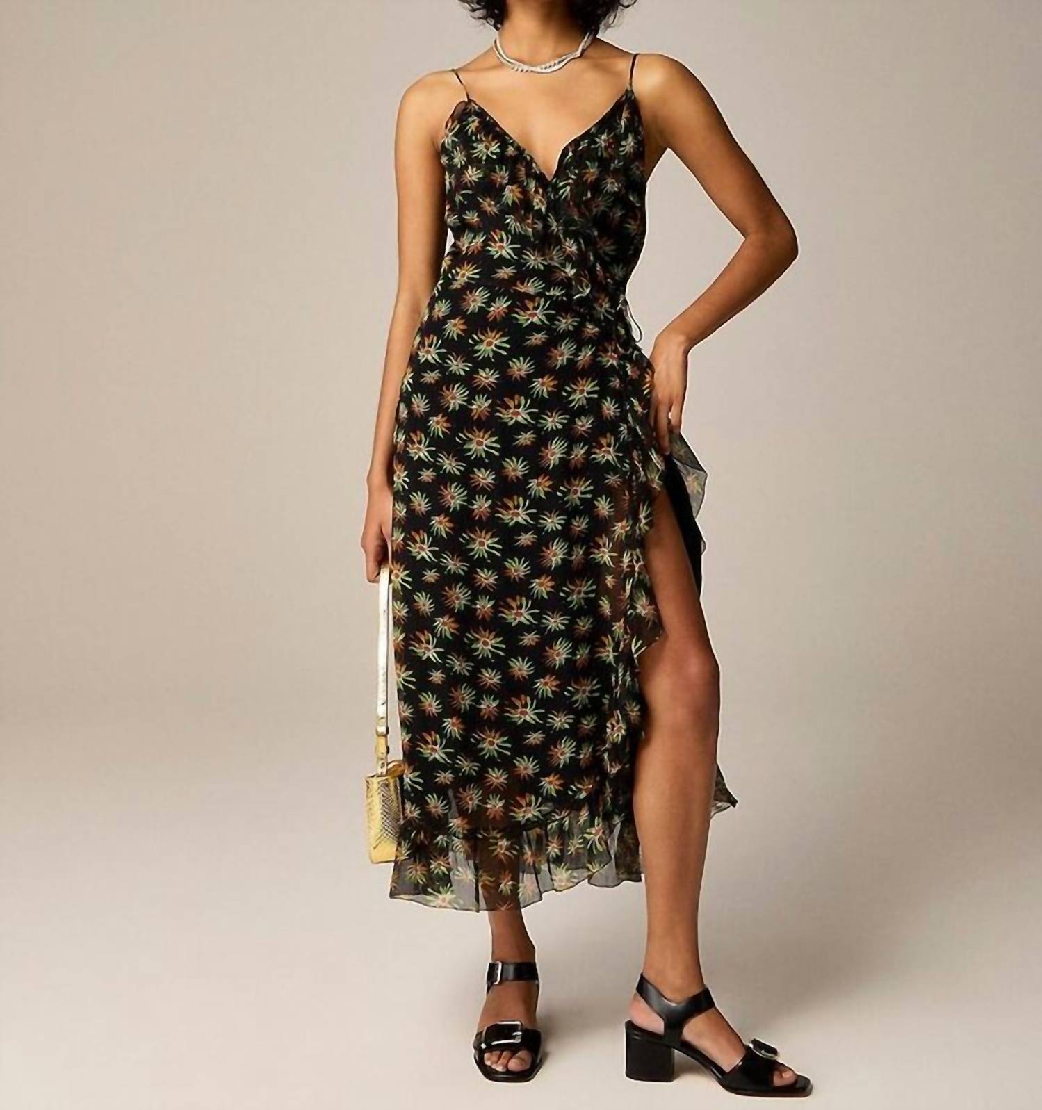A midi dress so versatile, your options for wearing it are endless. Discover the elegance of the Flutter Wrap Dress In Sunburst Floral by J.Crew, a sophisticated addition to any summer wardrobe. Designed with spaghetti straps and crafted from 100% cupro, it features a V-neckline and sheath silhouette for a flattering fit. This dress falls above the ankle, measuring 50" from the high point of the shoulder, and is lined for added comfort. Made in India, it offers the convenience of being machine washable for easy care.