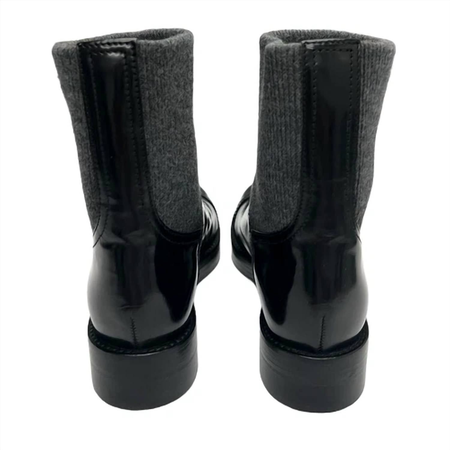 Say hello to the perfect, most versatile boot. The ankle height makes this style easily transition from day to night. Wear them with your favorite skinny jeans and tee for a more laid back look, or pair them with your favorite mini dress and jacket for a night out on the town. Step into style with the Women's Rib-cuff Boots in Italian Leather by J.Crew, a chic choice for any fashion-forward wardrobe. Expertly crafted from premium Italian leather, these ankle boots feature a cozy ribbed-knit shaft that ensures both comfort and ease of wear. The round toe and flat heel height of 0.78 inches provide a practical yet stylish silhouette, perfect for everyday adventures. Available in a versatile black and grey color combination, these boots are a must-have addition to your footwear collection.