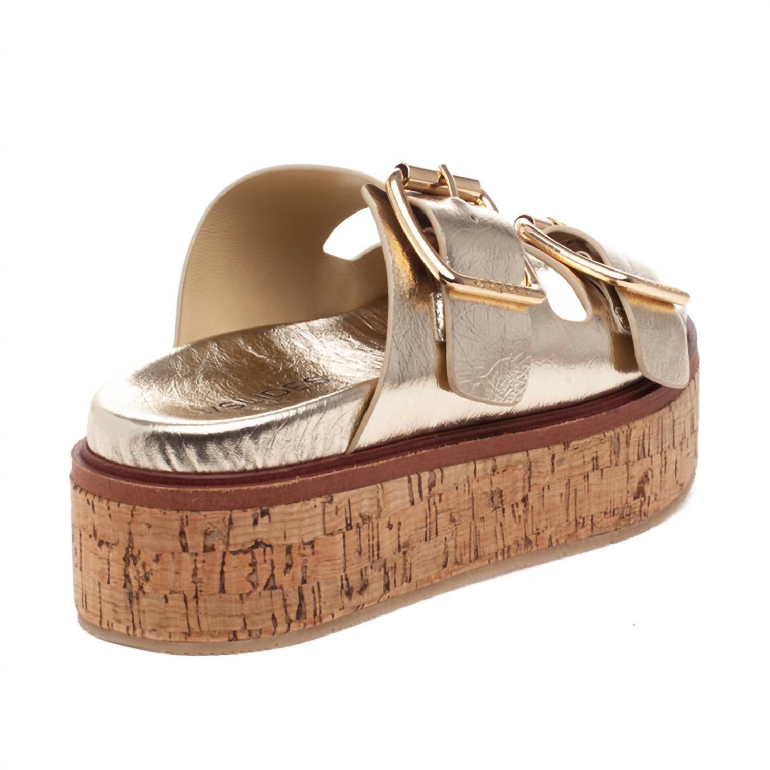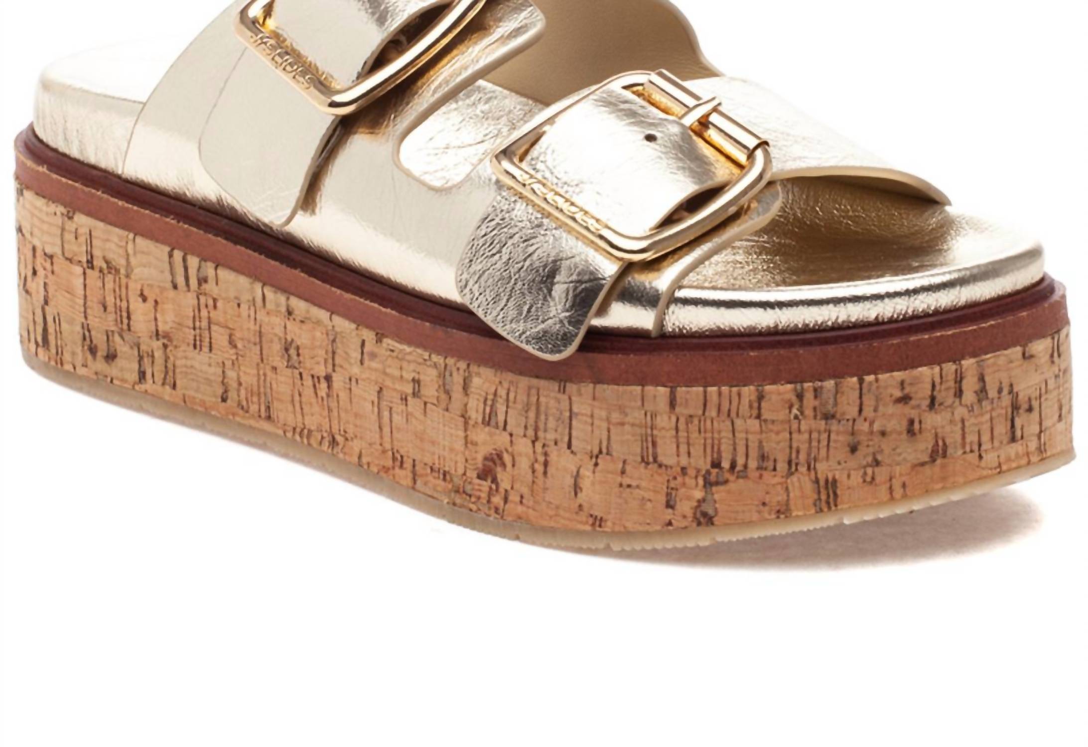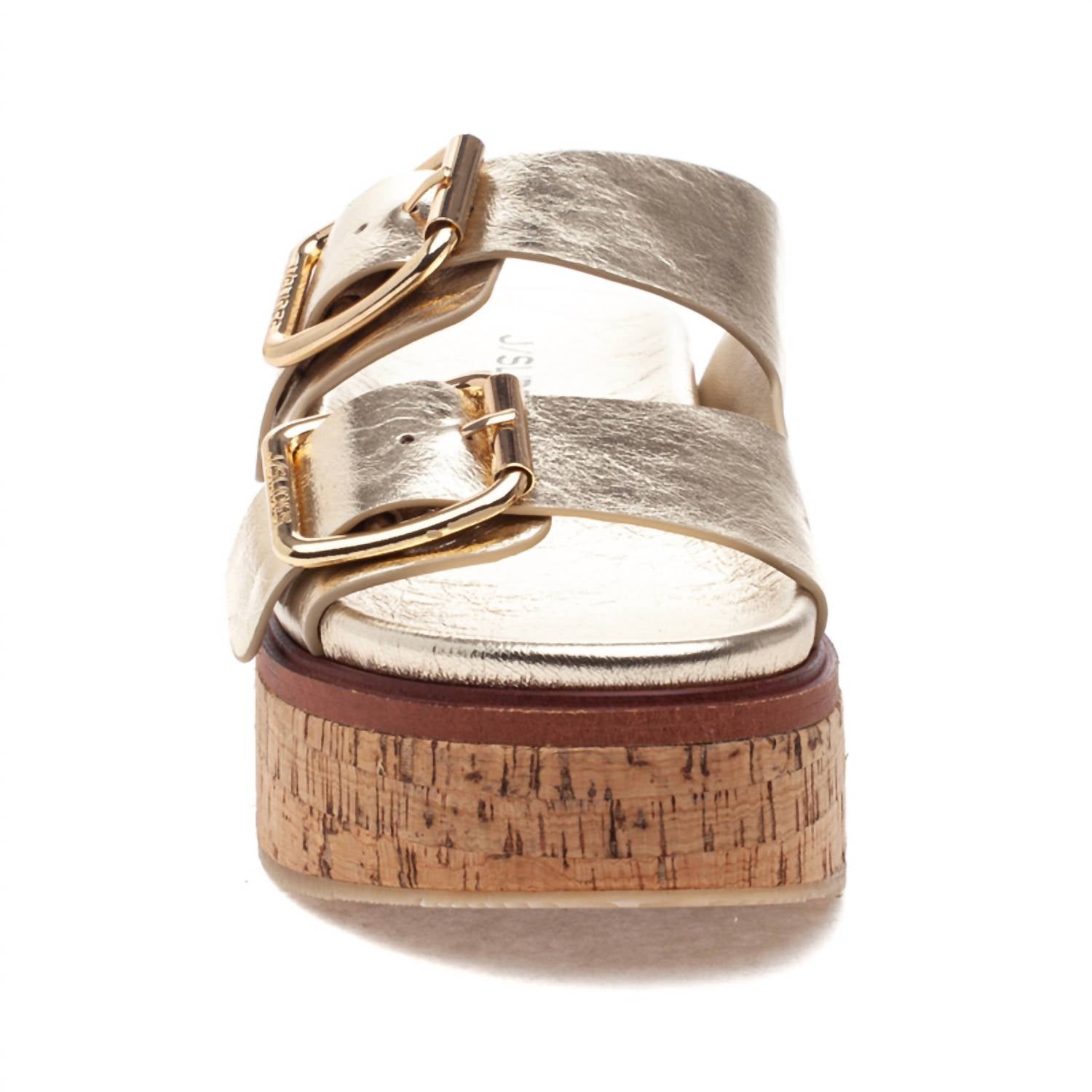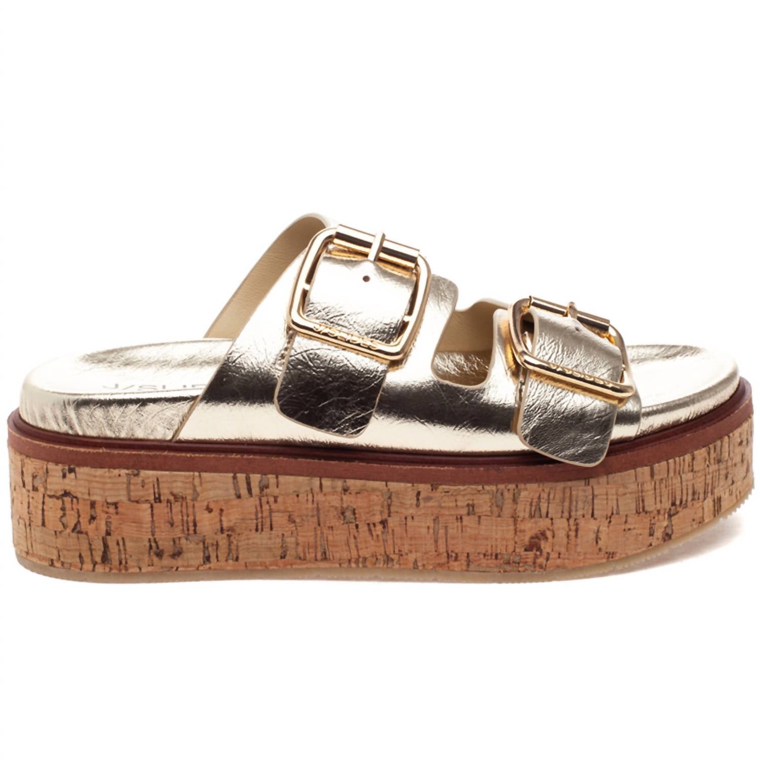 Step into style with the Women's Belinda Platform Sandal by J/SLIDES, radiating in a lustrous gold hue. These sandals feature a leather upper and lining, combined with a comfortable cushioned footbed, ensuring all-day wearability. With a natural cork platform standing at approximately 1.5", these sandals provide both lift and comfort. Equipped with adjustable buckles, they promise a secure fit and are perfect for any casual outing.
